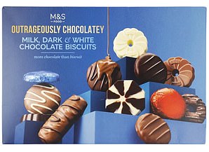 Next, another container of sweet treats that will ensure harmony throughout the festive period Marks and Spencer’s Outrageously Chocolatey Milk, Dark and White Chocolate Biscuit Selection, priced at £6.50.