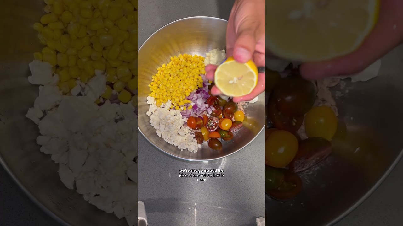 This tuna pasta salad packs over 100 grams of protein, takes 10 minutes to put together, and tastes amazing. This is how you do it. First, get two cans of tuna in a big bowl. I’m using Safe Catch, which has 43 g of protein per can, and test every tuna for mercury, so no need to worry about that. I’m getting some tomatoes in there, also half a red onion, half a can of corn, some feta cheese to beef up the protein a little more. Add two scoops of Greek yogurt and two scoops of mayo. We’re also going to add the juice of one yellow lime in there. Add about two stalks of celery in there, too. And then season with the seasonings I have listed here. Nothing crazy. Then finally, add some pasta in as much or as little as you want. Give it a really good mix. Serve it immediately or let it cool in the fridge first. It’s an easy 100 g of protein right there. can take it with you for lunch, meal prep it, whatever you want to do with it.