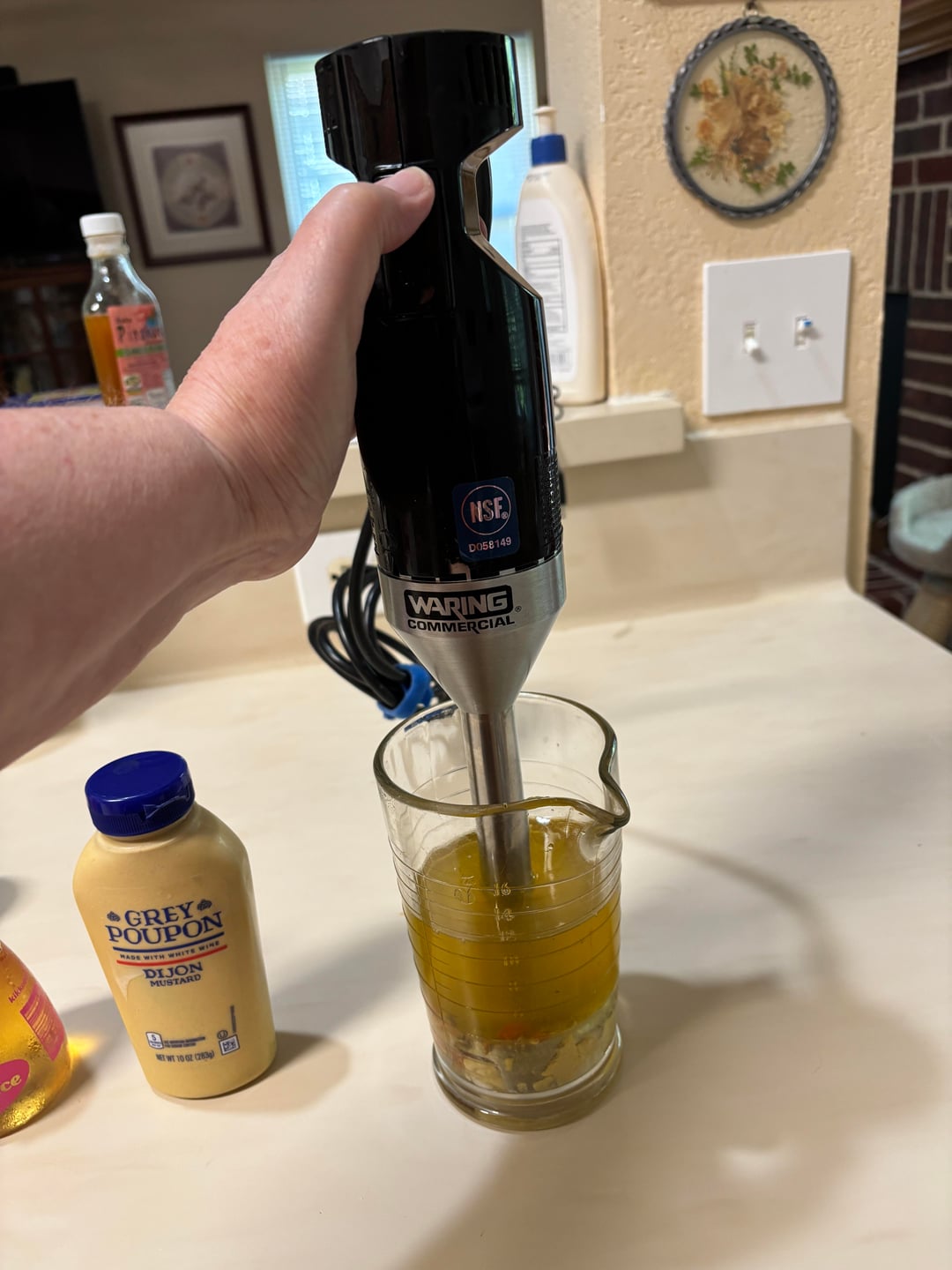 (8-10) Add 1 cup of oil. I put my tin oil in the bottom, then filled to 3/4 c level with canola oil (any neutral oil will do) and then topped off with 1/4 c Extra Virgin Olive oil. Add to the egg and mustard.