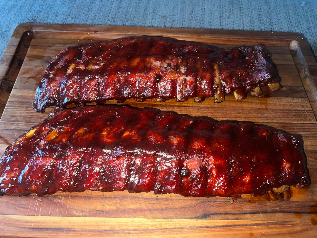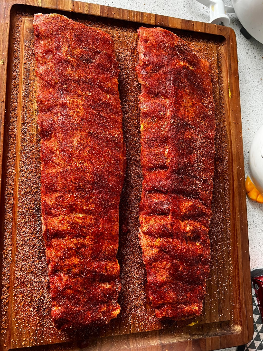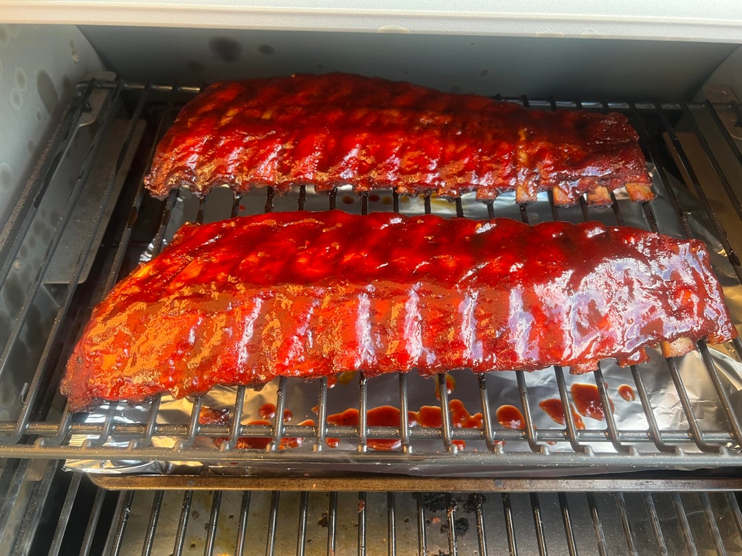 275 until the rub stuck to the meat completely, bathe in aluminum boat after with butter, brown sugar, honey and when it reached 206, baste with sauce for 15 mins.