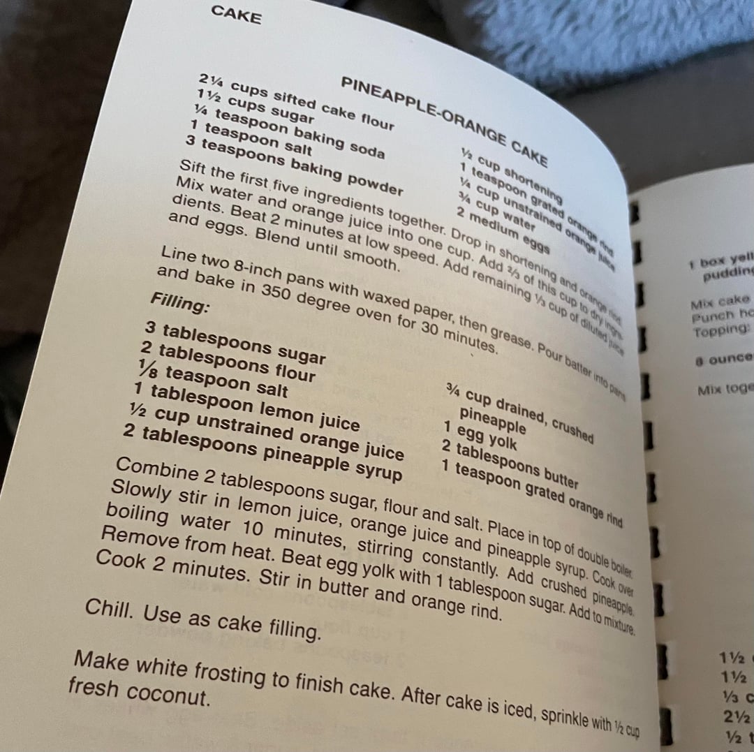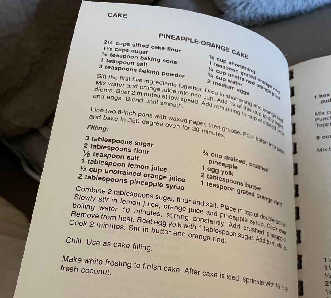 #PINEAPPLE-ORANGE CAKE 2¼ cups sifted cake flour 1½ cups sugar ¼ teaspoon baking soda 1 teaspoon salt 3 teaspoons baking powder ½ cup shortening 1 teaspoon grated orange dog ¾ cup unstrained orange juice ¾ cup water 2 medium eggs
