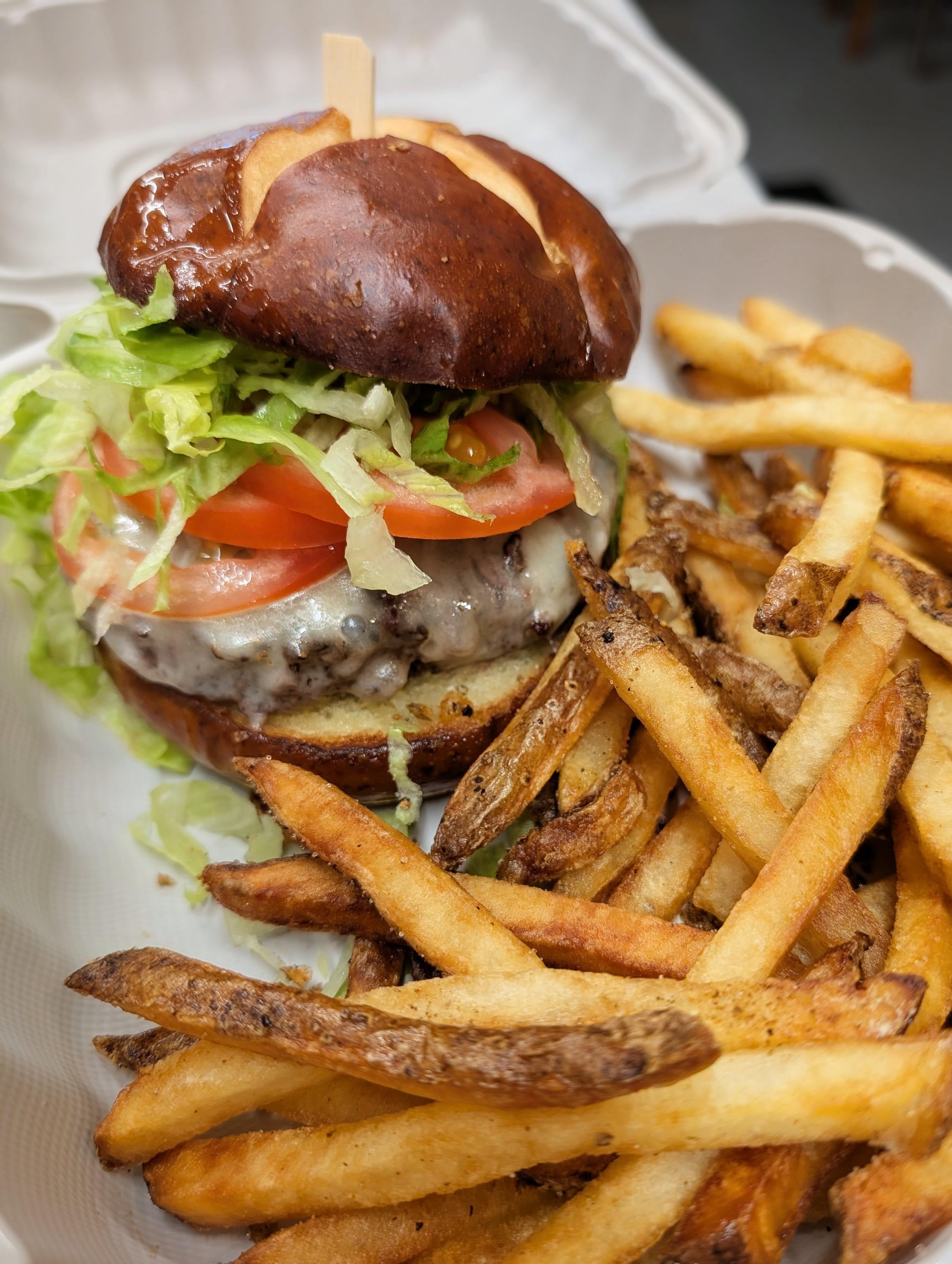 They’re generally too crunchy for my liking but I can appreciate a soft pretzel bun. Burger and fries look great though.