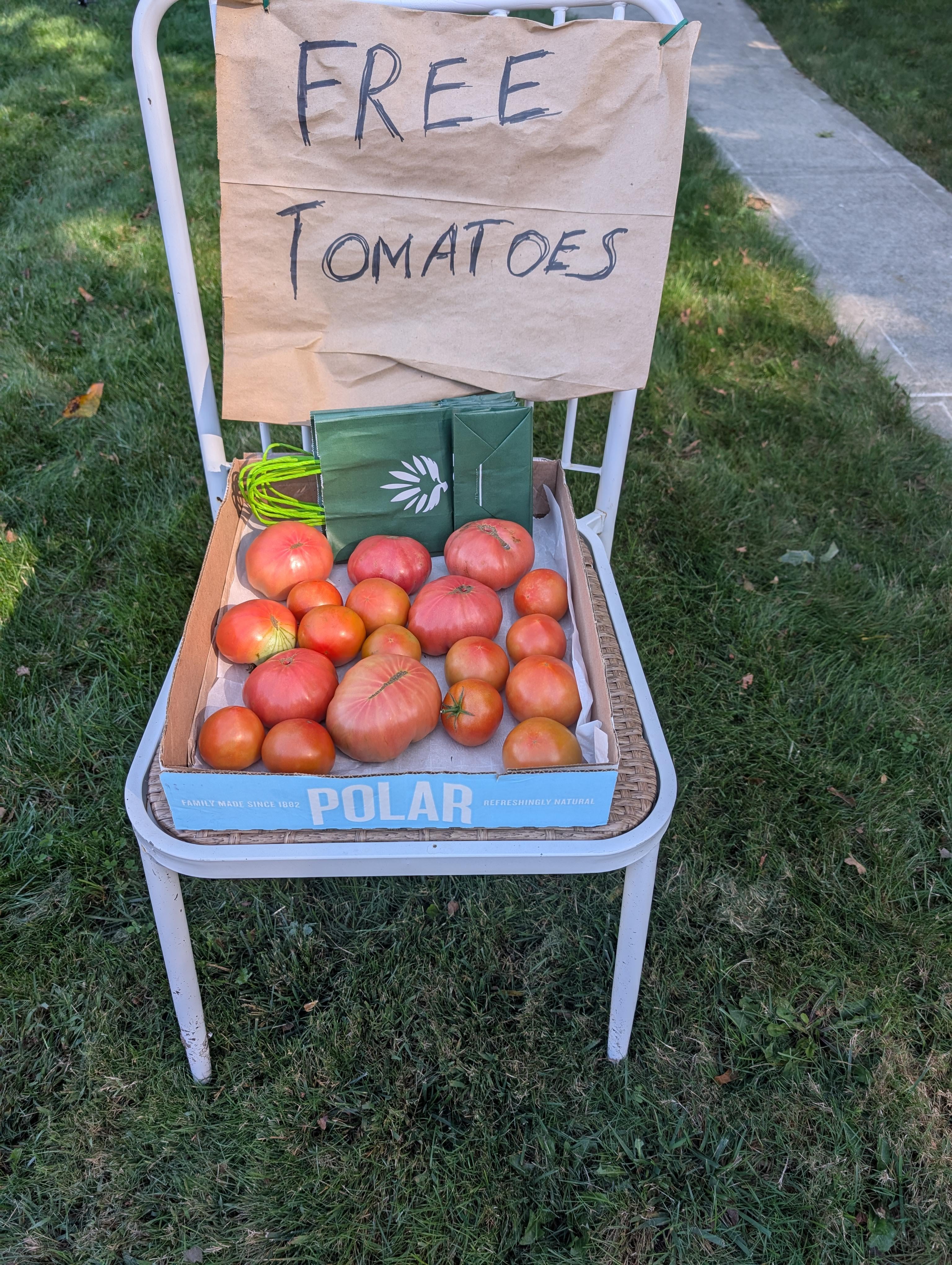 I love growing tomatoes but tomatoes literally kick my ass. My wife had been giving them away at work but she is off for next few days. So I made a sign.by Responsible-Two4642 Dining and Cooking