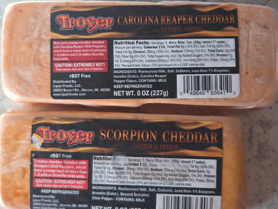 Found this at my favorite butcher shop. I have not tried the Scorpion Cheddar yet, but I can vouch for the Carolina Reaper Cheddar. It is not 2 million scoville hot, but it IS hot. It makes the Reaper Cheese from Kraft seem like Velveeta, which it basically is. This is from Michigan so not sure where all it is available, but if you see it get it. I recommend it.