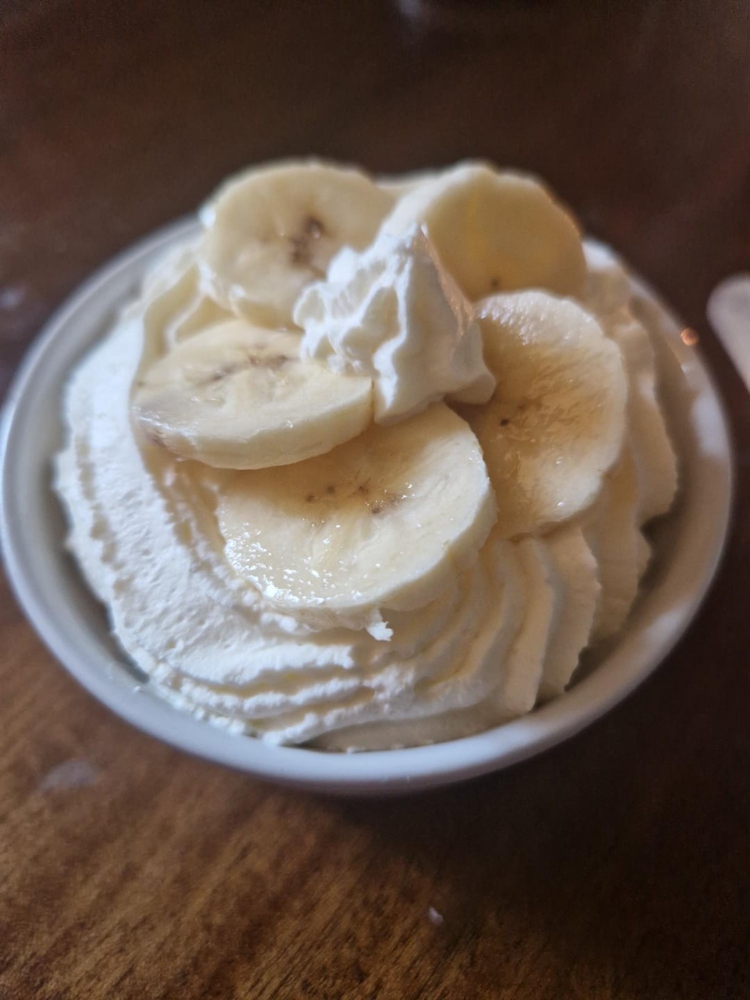 To the dessert! So what is Créme-Vitæpanis pie? Basically a custard with a layer of corn flakes (the first name was vitæpanis) and whipped cream with sliced banana on top.