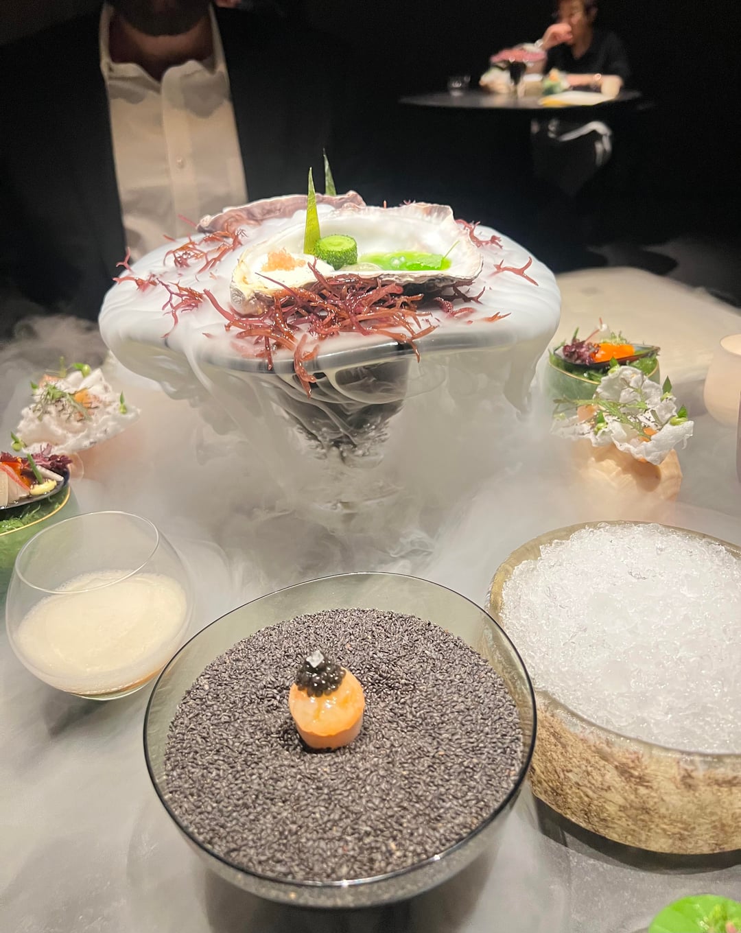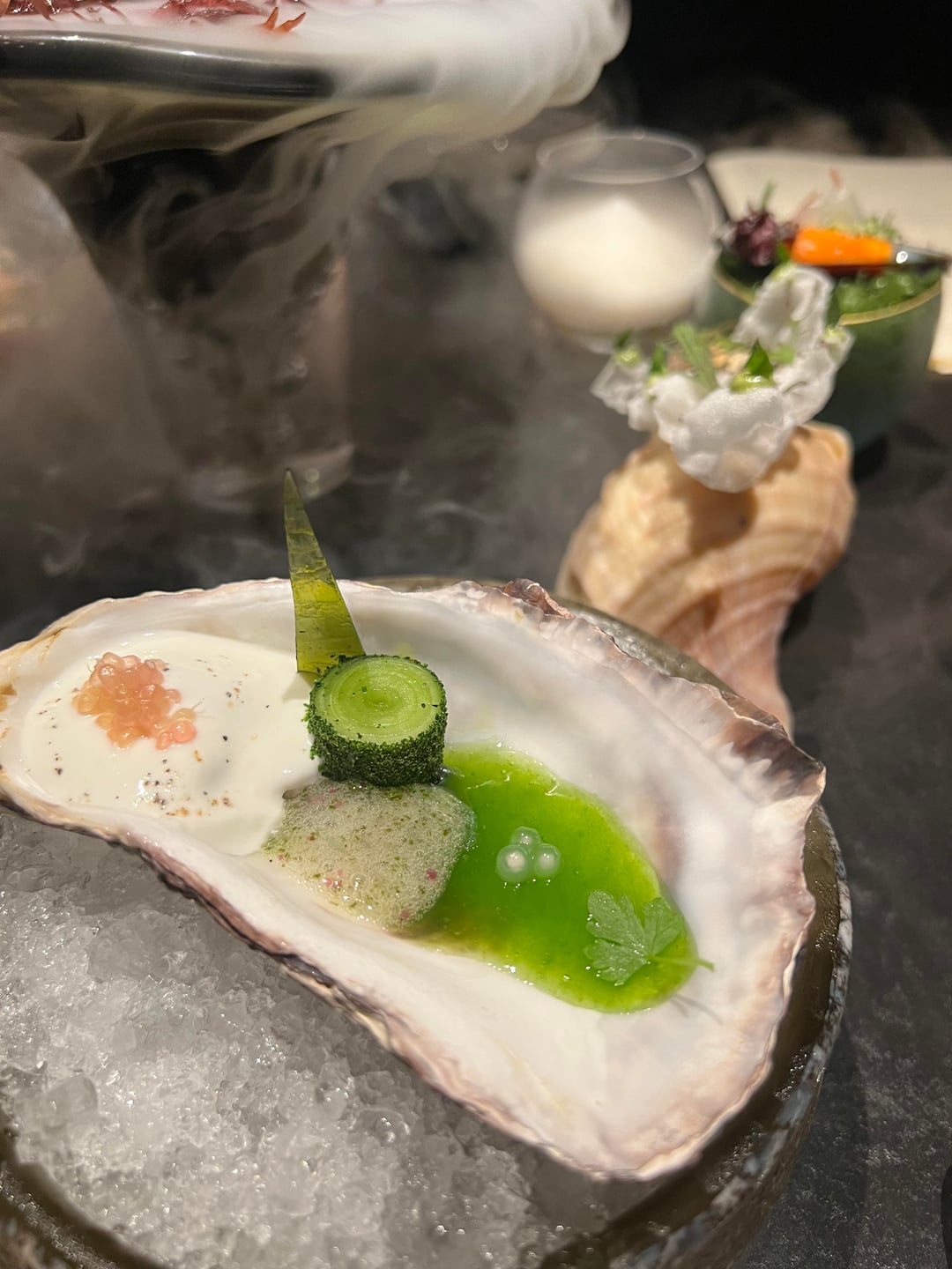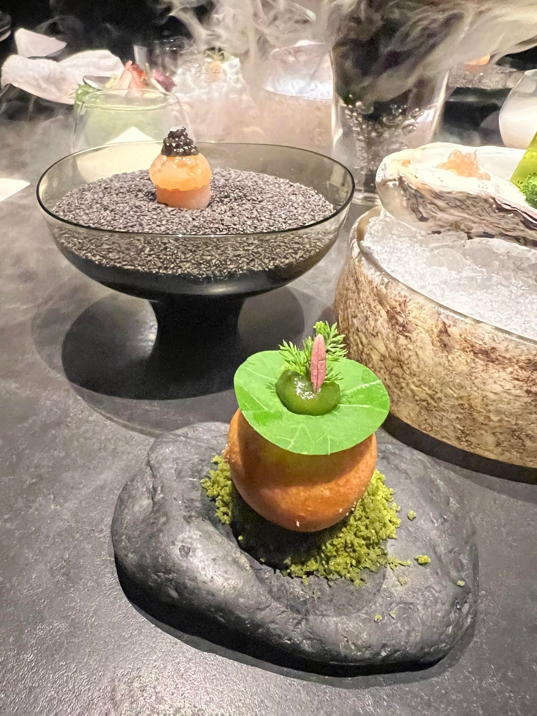 - A series of dishes called "Rocky Coast": The sea water over dry ice was a bit of a gimmick, but the resulting fog had a distinctly briny aroma which actually enhanced the rest of the dishes. It consisted of shrimp and caviar on top of a pastry (loved), an oyster with a bunch of stuff in it (incredible, creamy and vegetal), some sort of fried ball with a leaf on top (good but not super memorable a month later), and a mussel with robust red bell pepper sauce (excellent and one of our favorite dishes of the evening).