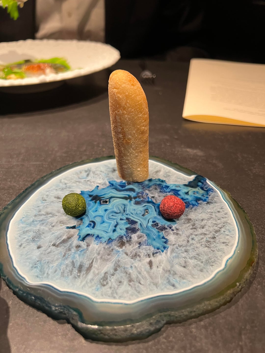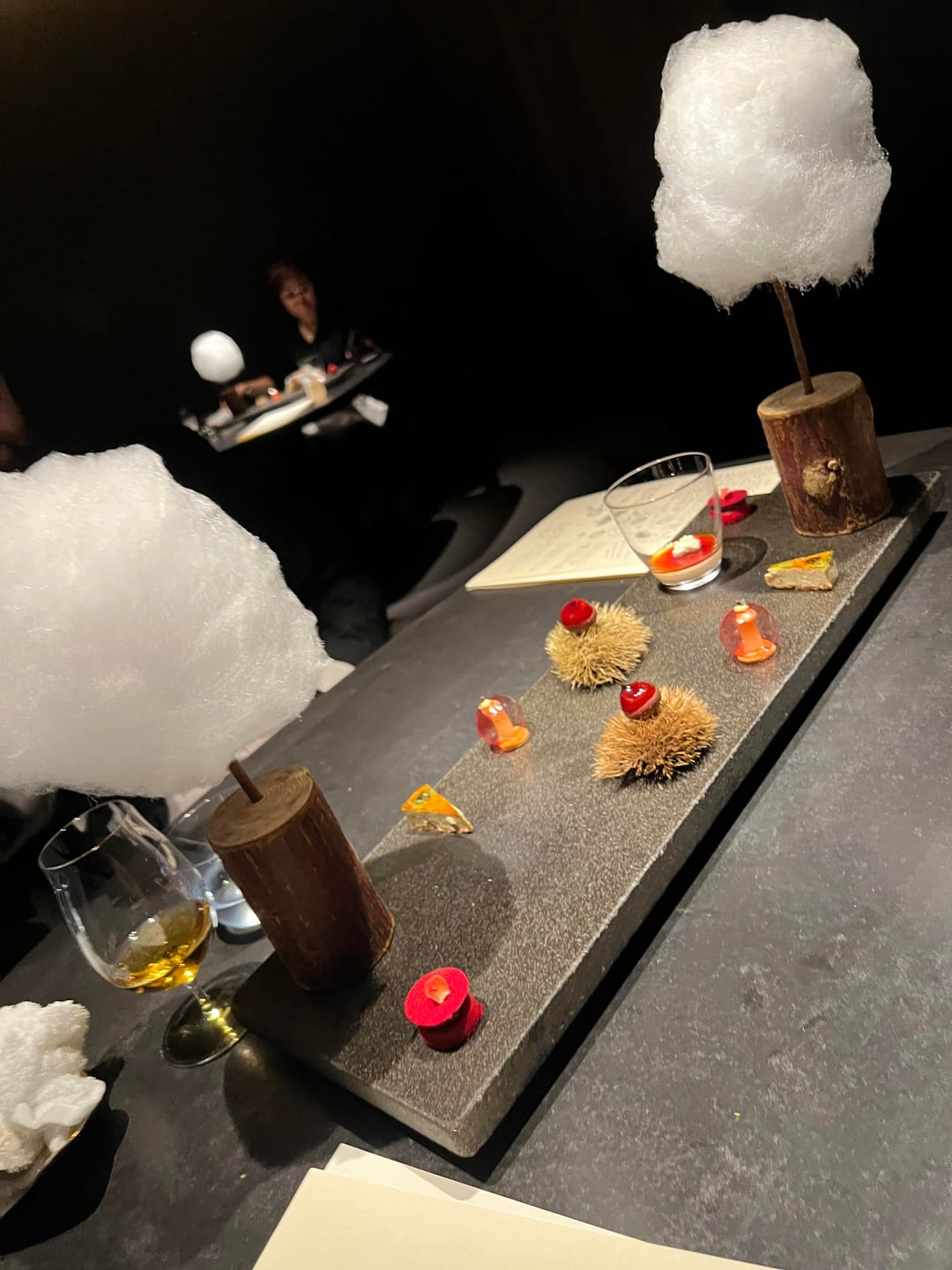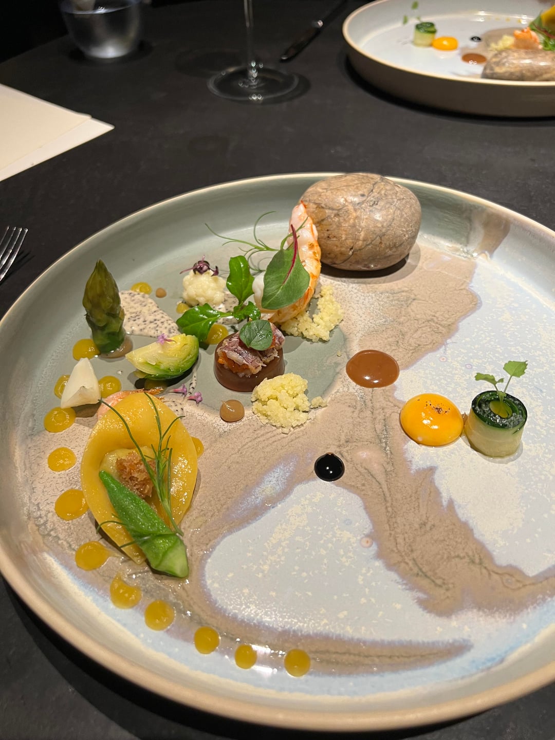 - A series of dishes called "Rocky Coast": The sea water over dry ice was a bit of a gimmick, but the resulting fog had a distinctly briny aroma which actually enhanced the rest of the dishes. It consisted of shrimp and caviar on top of a pastry (loved), an oyster with a bunch of stuff in it (incredible, creamy and vegetal), some sort of fried ball with a leaf on top (good but not super memorable a month later), and a mussel with robust red bell pepper sauce (excellent and one of our favorite dishes of the evening).