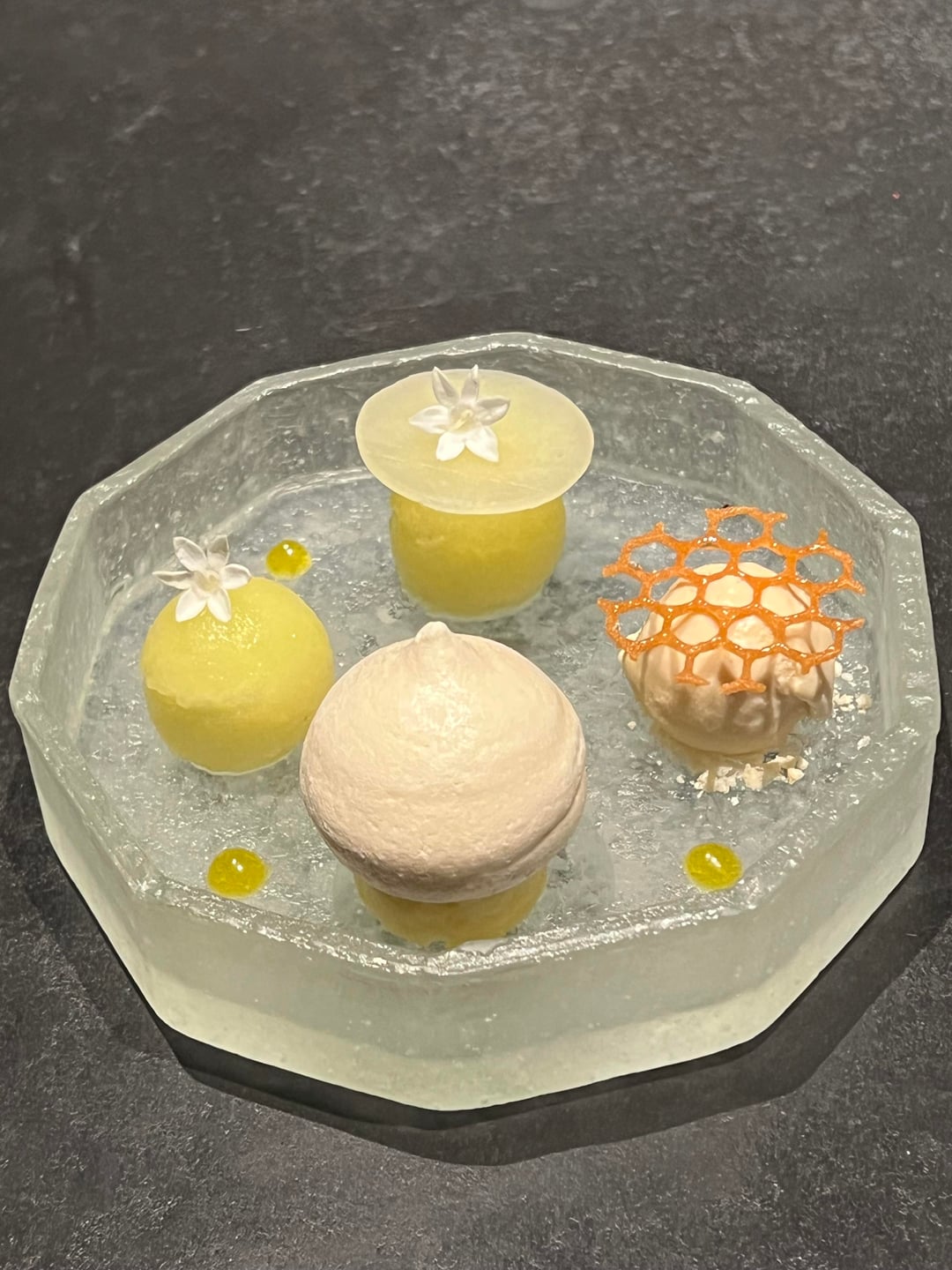 - Dessert 2: Look at that beautiful leaf! This was really good. The little ball thing was cold and sour. The most memorable part of the desert was the fried pear on top which was insane (I mean, it's a fried pear).