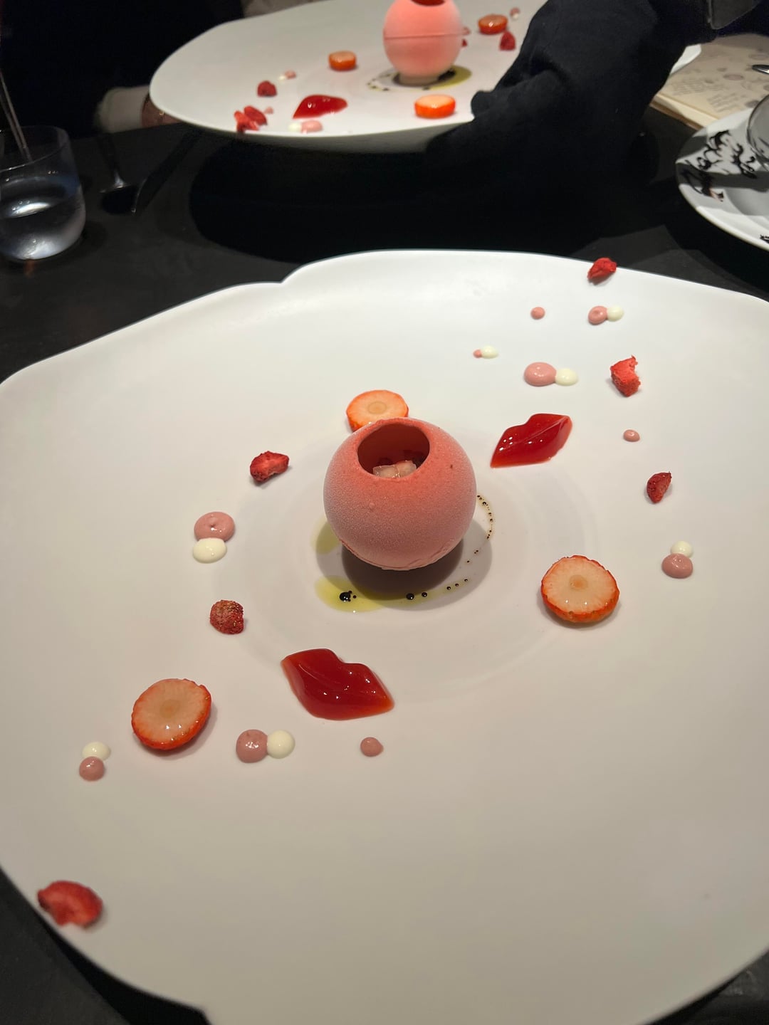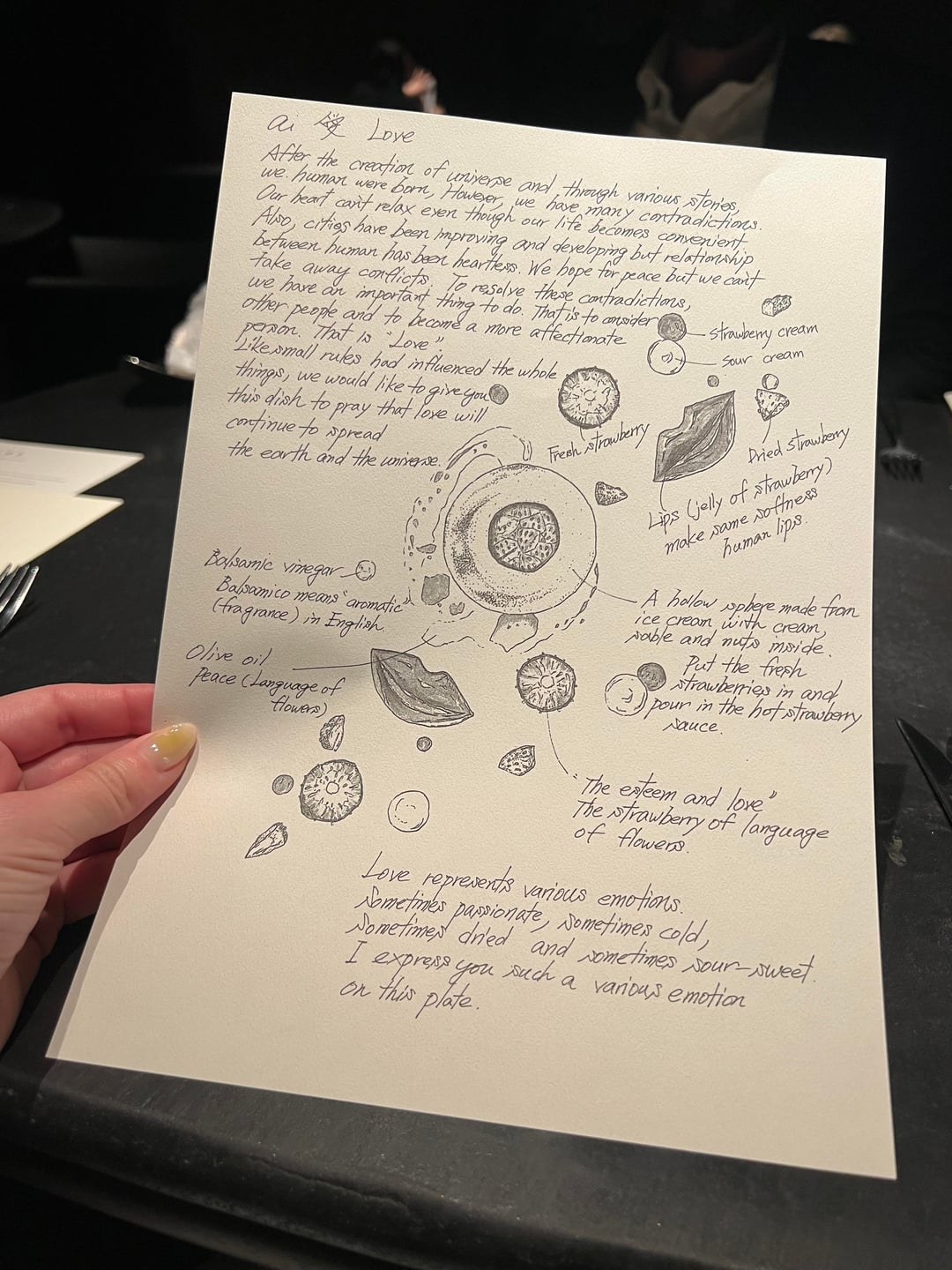 - Dessert 3 ("Love"): This dessert was called "Love." Before the dessert they hand you a drawing of the dessert which has a little essay about love. That sort of thing would strike me as corny, but this meal was good enough that it honestly made me a bit emotional. Love was awesome, lots of different presentations of strawberries.