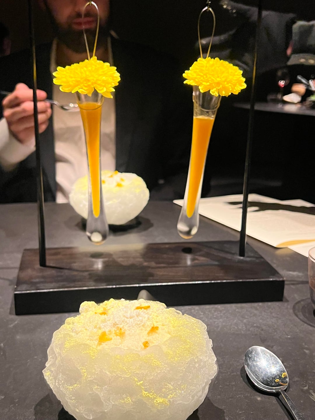 - Dessert 1: This was some sort of frozen cheese in a bowl made of ice and you poured the chrysanthemum liquid over the top. Tasted awesome (I'm pretty drunk at this point in the dinner, so "tasted awesome" is the best I can do.)