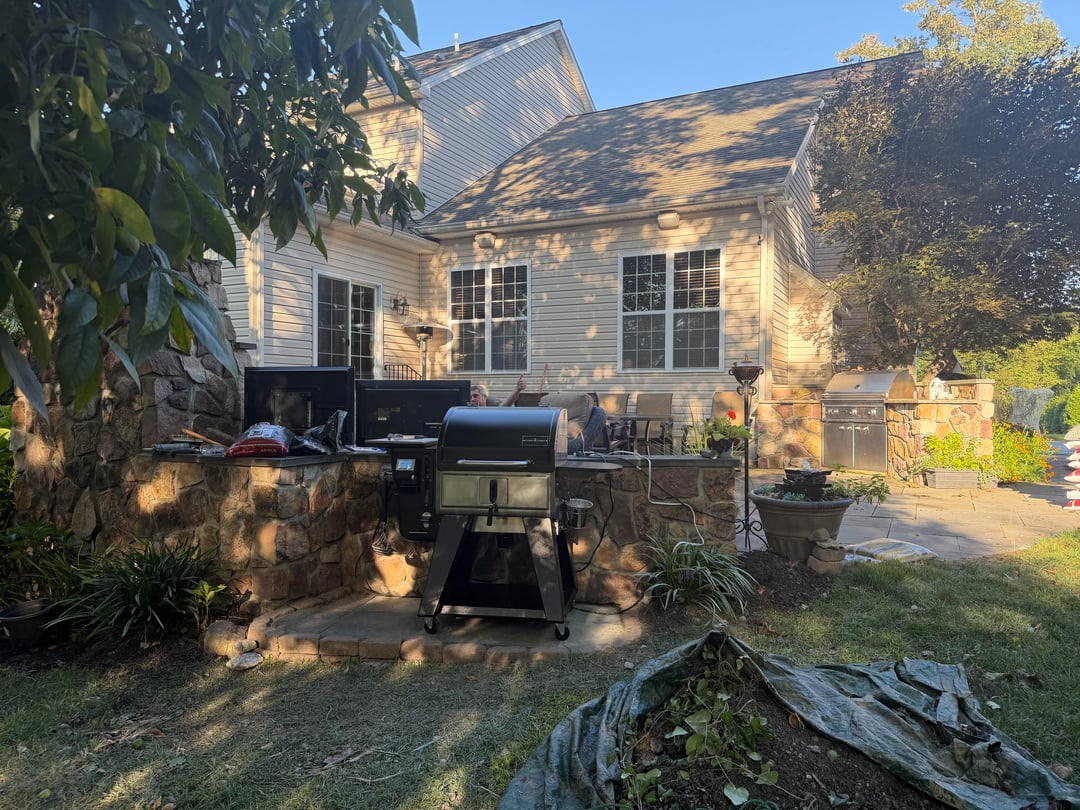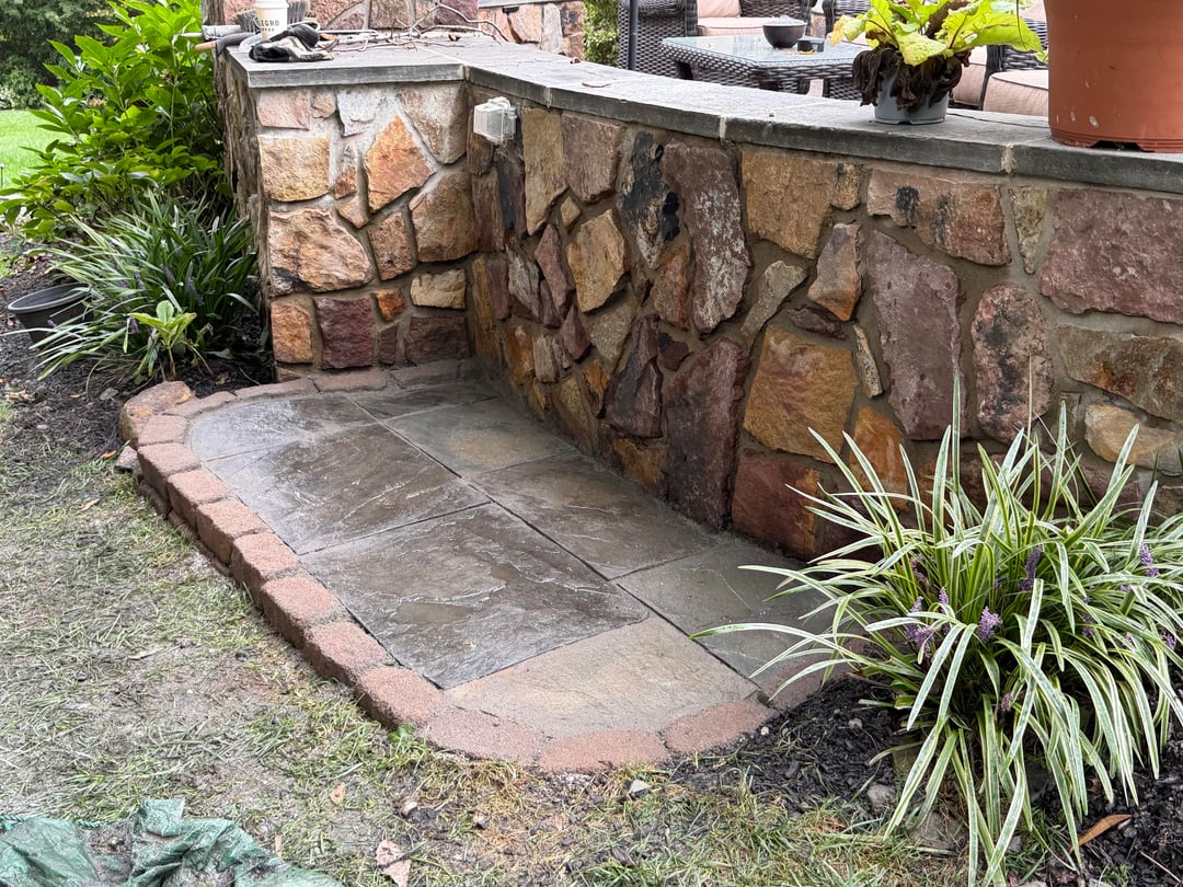 Had to build a flat patio extension on the other side of my existing patio to hold it and get it out of the way of foot traffic. Patio tool three days of fairly hard work but came out nice and matches the stone of the existing. Good amount of space to hold the grill, propane, and a container for pellets etc.