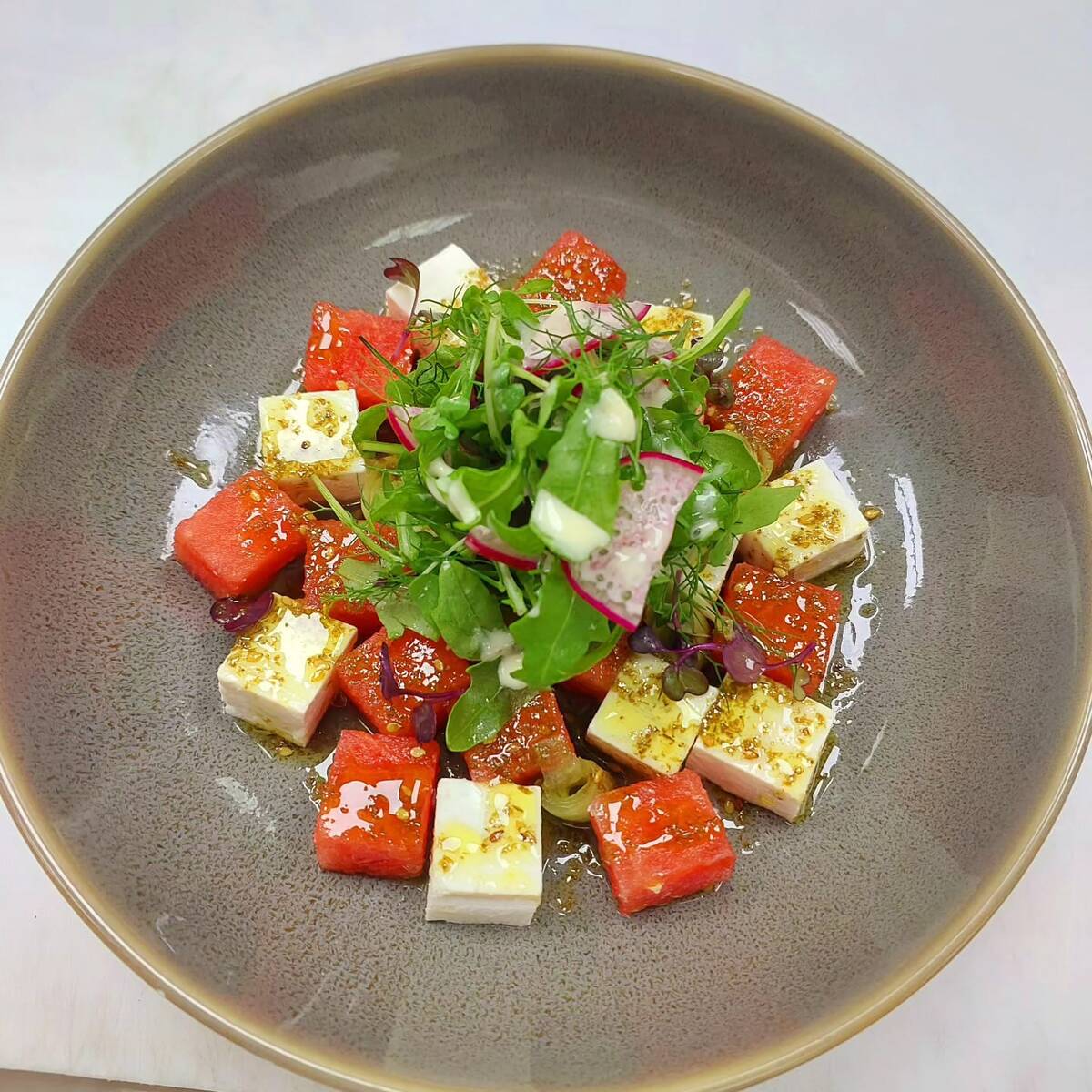 Chef Mevish’s Greek watermelon and feta salad with honey zaatar dressing. (Supplied)