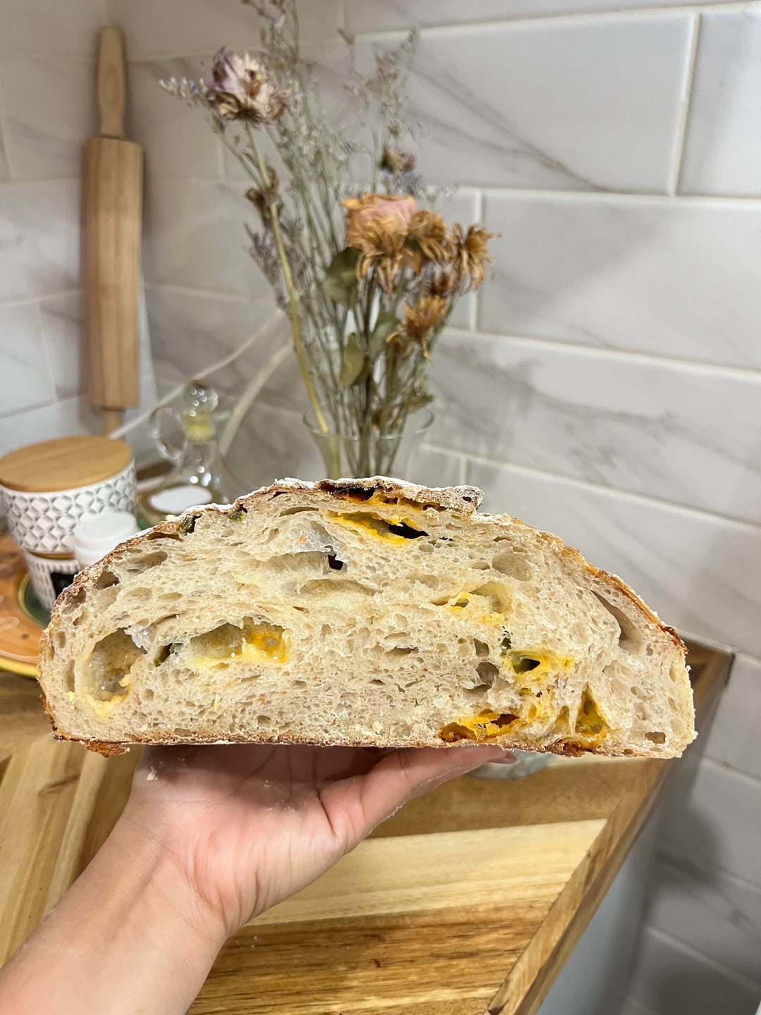 After I mixed the starter with the autolysed dough, I waited 40mins to do 4 sets of stretch and fold (30mins interval) on my last set of s&f I added half of the inclusion. My dough was around 80F and my room temp is 26C so I let it bulk ferment for about 6.5 hours then did my final shaping and added the rest of inclusions. Put it in the fridge for 9hrs then open bake 30mins; 450F; with hot water at the bottom. 18mins; 425F; without the hot water.