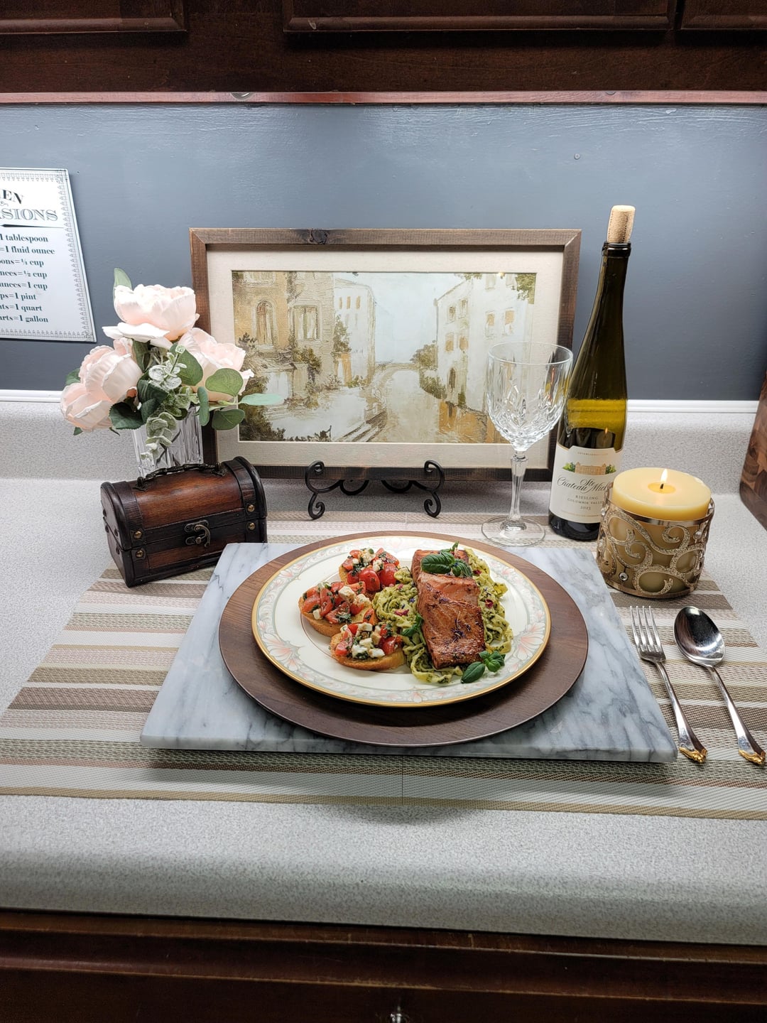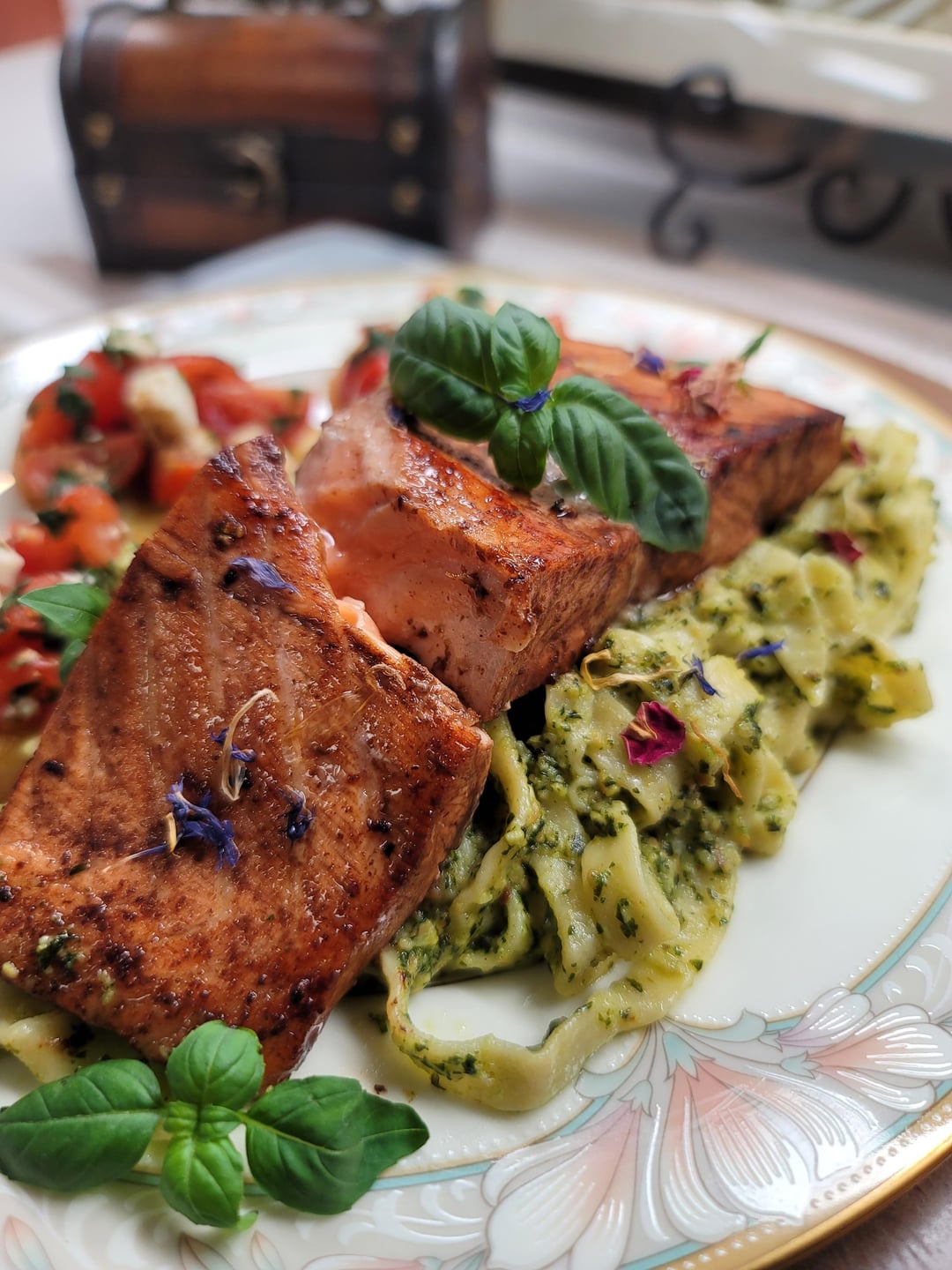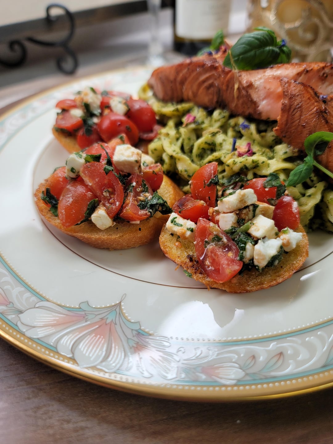 [Homemade]Balsamic Glazed Salmon Over Fresh Pasta w/ Basil Pesto and Bruschetta!