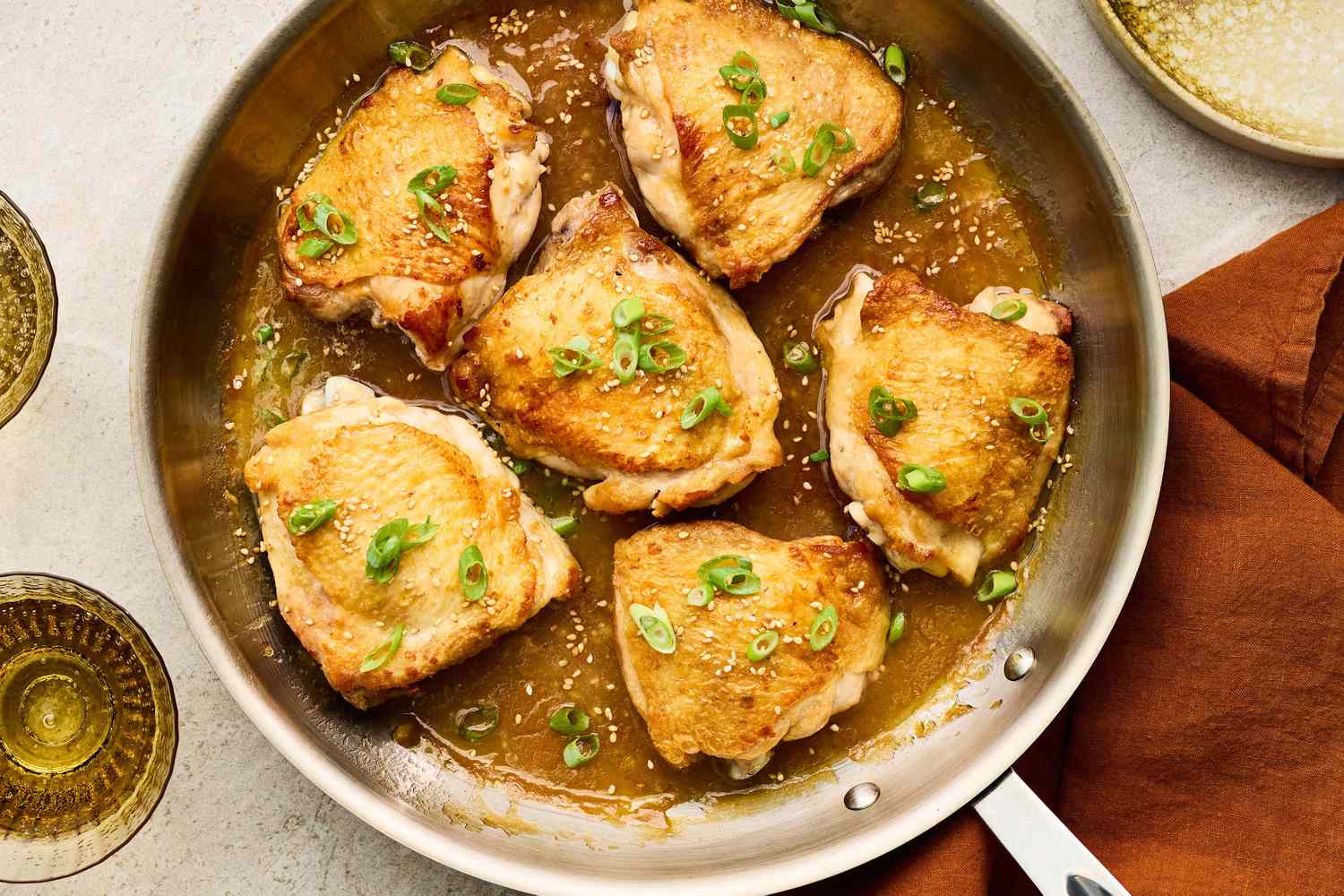 Because this goes from stovetop to oven, choose a heavy, oven-safe skillet so the skin renders evenly and the sauce reduces without scorching. For extra-crispy chicken thighs, make sure to not crowd the pan and work in batches if needed so the chicken sears rather than steams. Start skin side down in a cold skillet to encourage gradual rendering and prevent shrinkage. Spoon off excess fat as it collects; you want sizzle, not pooling. Let the thighs sear undisturbed until they release easily. Finish to 170°F, rest five minutes, then glaze and garnish with scallions and sesame seeds.