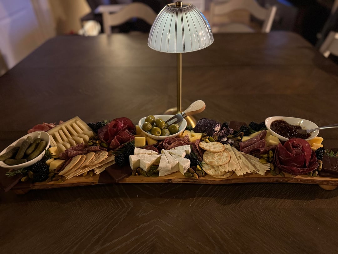 I made this back in December 24’ so I can’t give the exact names/brands for everything but I hope it’s intuitive. I used manchego (triangle arrangement), smoked gouda, brie, maybe cheddar, and blueberry lemon goat cheese. There was an assortment of beef salami—one was a wine flavor(?) and I made little rosemary barriers to protect the meats from the blackberries. The roses were a beef prosciutto. First time trying cornichons—they were different from what I expected but still tasty. Croccantini flatbread and table water crackers are our favorite. Olives were blue cheese stuffed, compliments included chili fig jam, raw wildflower honey, milk chocolate squares and pistachios (none of us really care for nuts but I thought they’d pair well—it felt incomplete without a few sprinkles).