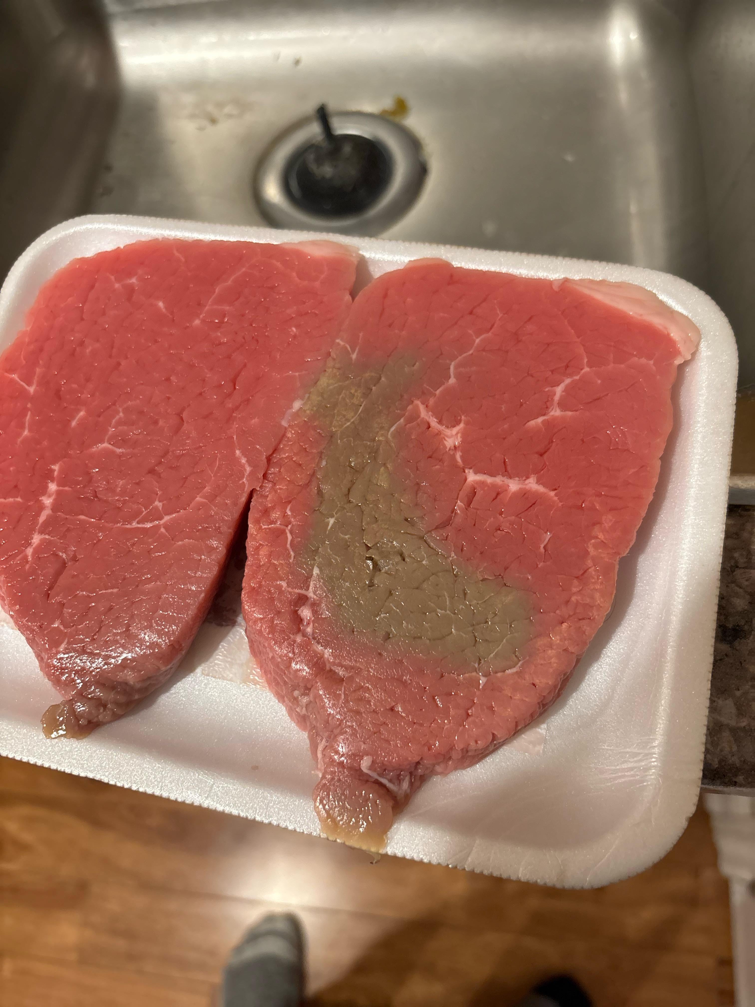 Could be freezer burn/it got oxygenised but I think that would happen on the edges of the cut not the middle. I…dunno if I’d risk eating these cause I can’t be 100% sure