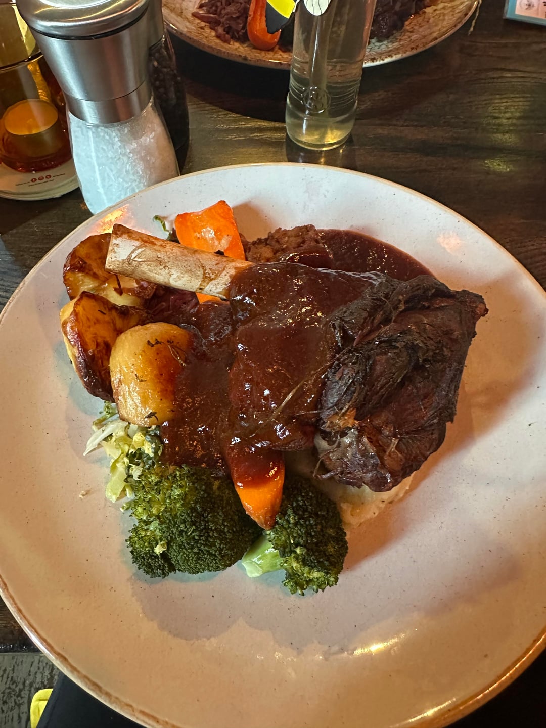 Lamb Shank, Mashed potatoes, Roast potatoes, Cabbage, Broccoli, Carrots, Stuffing, Beef gravy Most of it was hidden under the huge leg but it was amazing.Pub: Commercial Inn, Beeston, Nottinghamby llam4ry Dining and Cooking