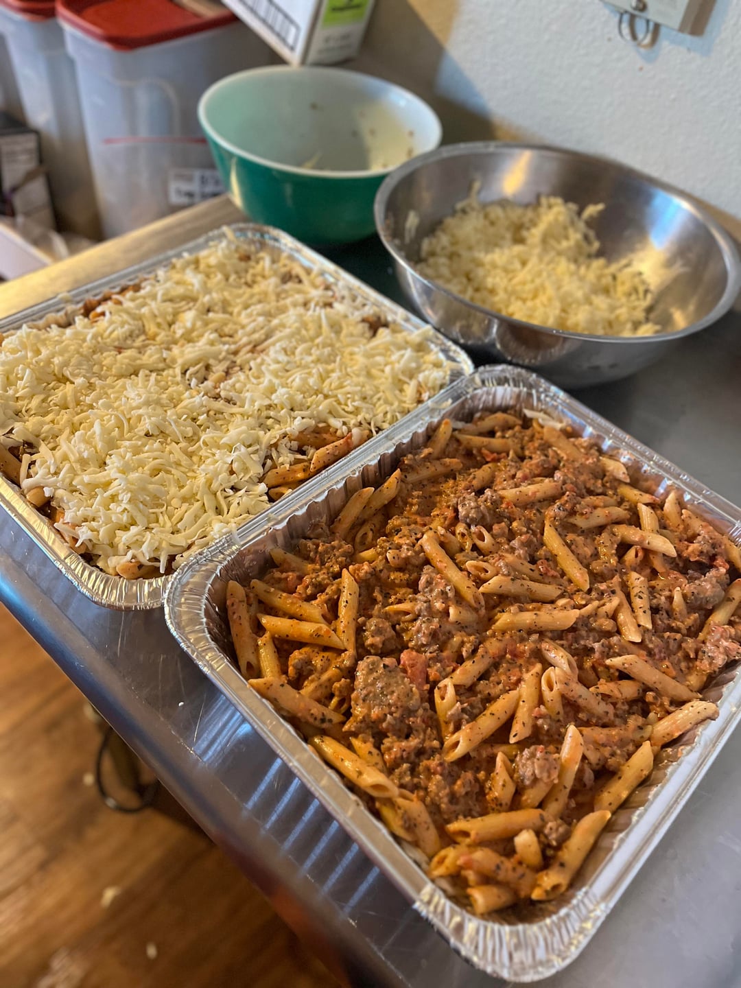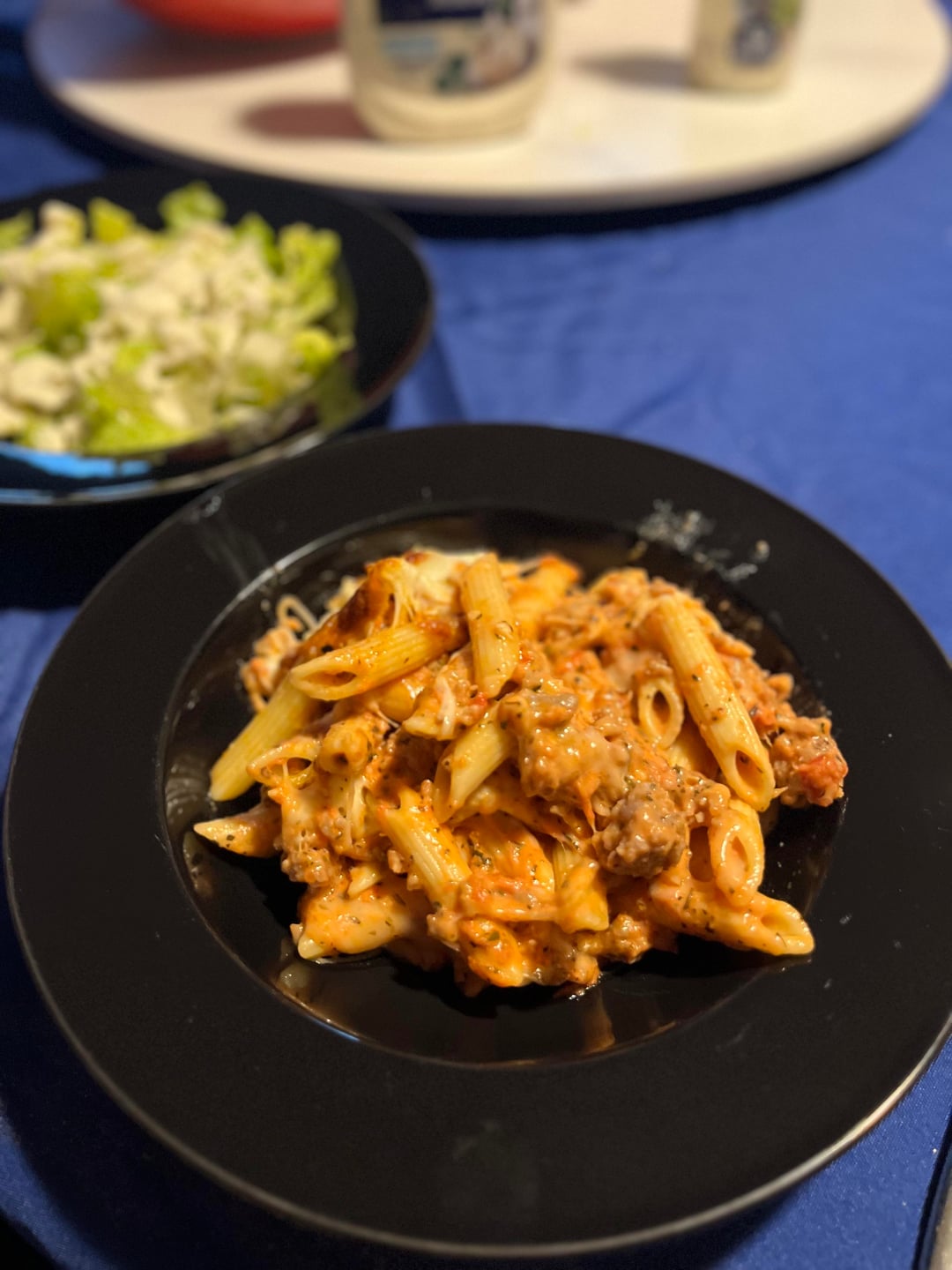 1 lb penne Rigate noodles 1½ lbs ground spicy or sweet Italian sausage (or removed from casings) 4 cloves garlic, minced 1 (28-oz) can crushed tomatoes 1 teaspoon salt 1½ teaspoons sugar ¼ teaspoon crushed red pepper flakes 1 cup heavy cream ⅓ cup plus 3 tablespoons grated pecorino Romano (or Parmigiano Reggiano cheese), divided ⅓ cup chopped fresh basil, plus more for serving 8 oz whole milk mozzarella cheese, shredded (about 2 cups)