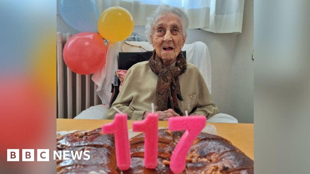 Reuters Maria Branyas, who has short grey hair, sat in front of a baked item with 117 candles on top and balloons behind her.Reuters