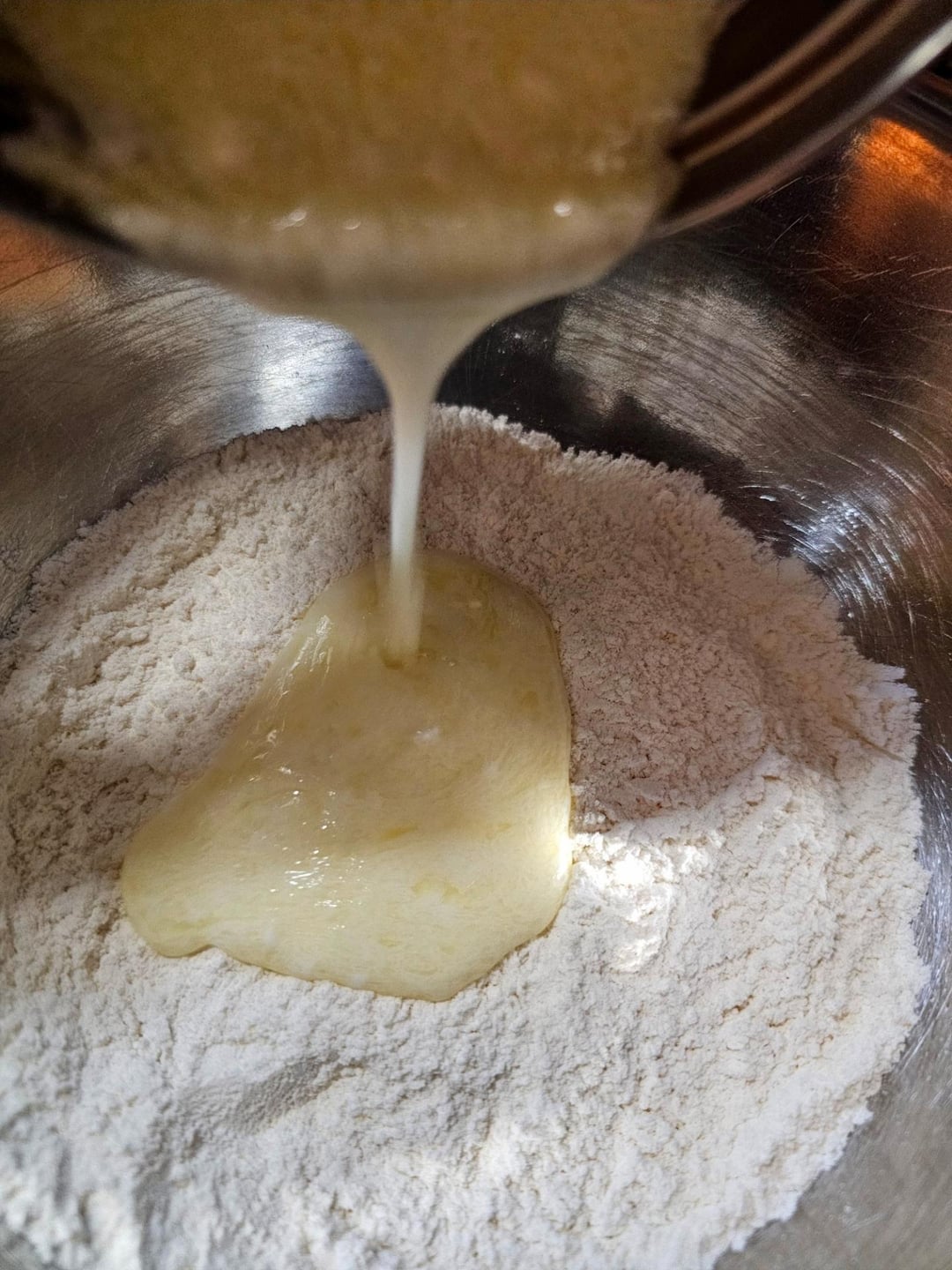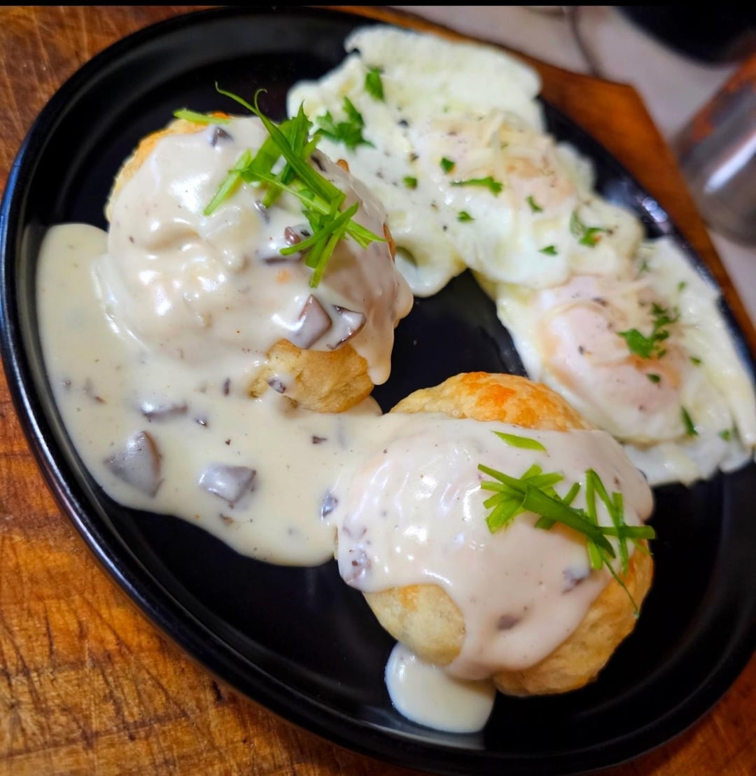 For the biscuits, I subbed buttermilk with sour cream thinned with water which worked great, they weren't as crumbly/dry as when I use buttermilk which some people like, but, I prefer a biscuit that doesn't need a chaser 😂 1/2 cup sour cream w/ 1/8 cup water & half stick of melted butter, combined in one bowl. 1 cup flour, 1/2 tbsp baking powder, 1 tsp salt, 1/2 tsp baking soda, 1 tbsp garlic powder, & 1 tbsp onion powder combined in another bowl. Mix the wet into the dry until you can form a ball of dough. Add shredded cheddar (better to shred your own) and separate into balls on a baking sheet w/ parchment paper. Bake @ 420° until the bottoms are browned.