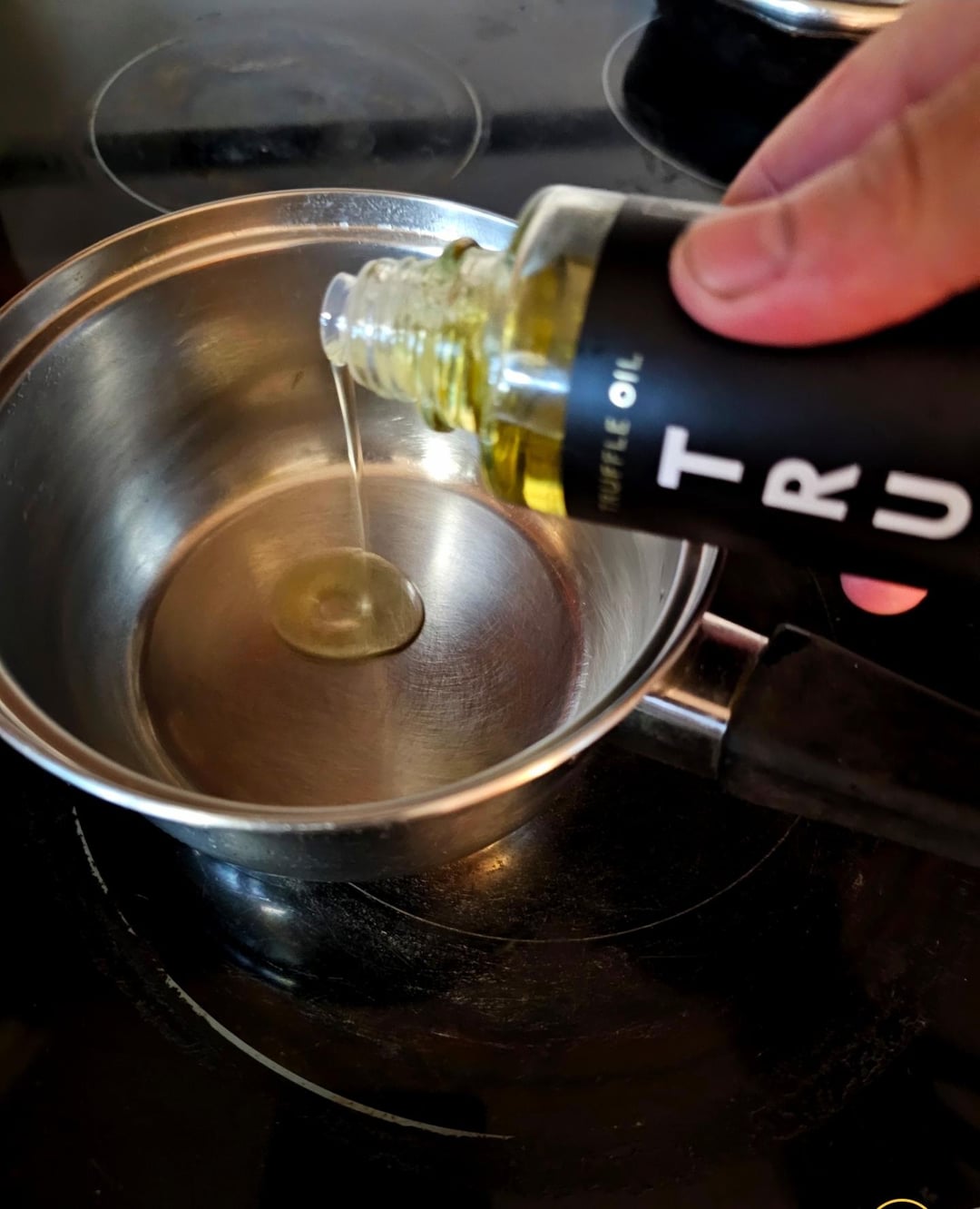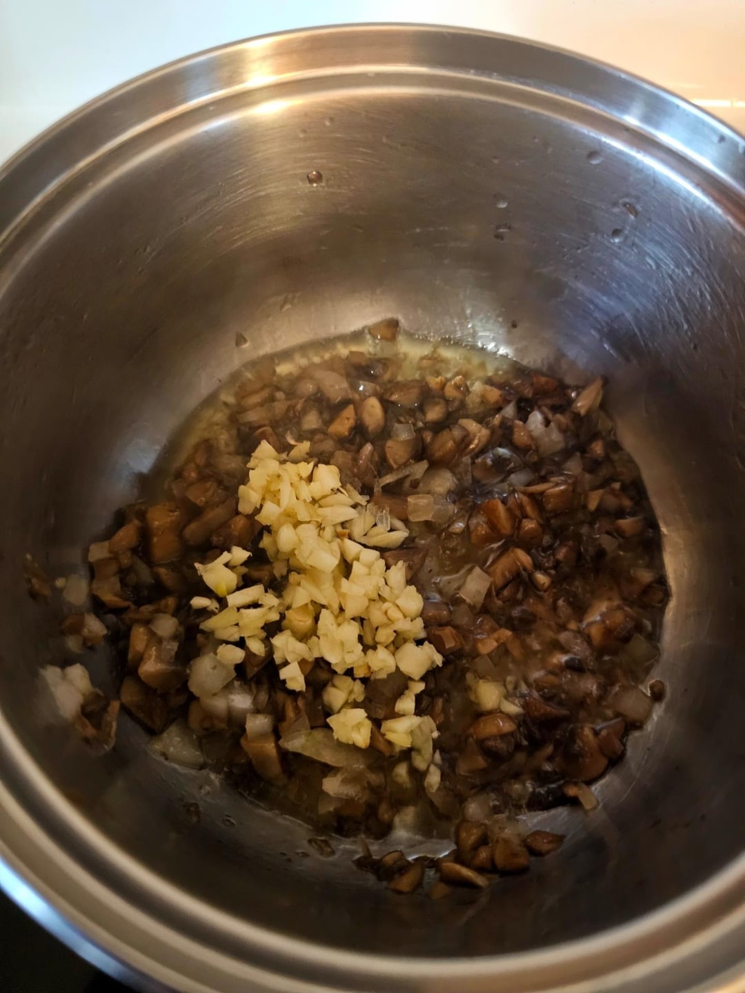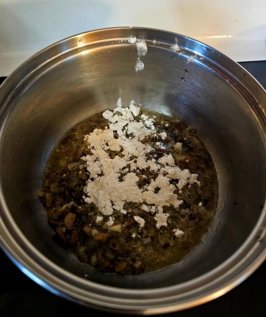 While those are baking, heat up some truffle oil and start cooking down some minced mushrooms. Once they're reduced and starting to brown stir in some onion and garlic until fragrent, melt some butter, then add enough flour to absorb any remaining liquid and coat everything. Cook until light brown then mix in heavy cream. Let it simmer to thicken, salt & pepper to taste, thin w/ vegetable broth as needed.