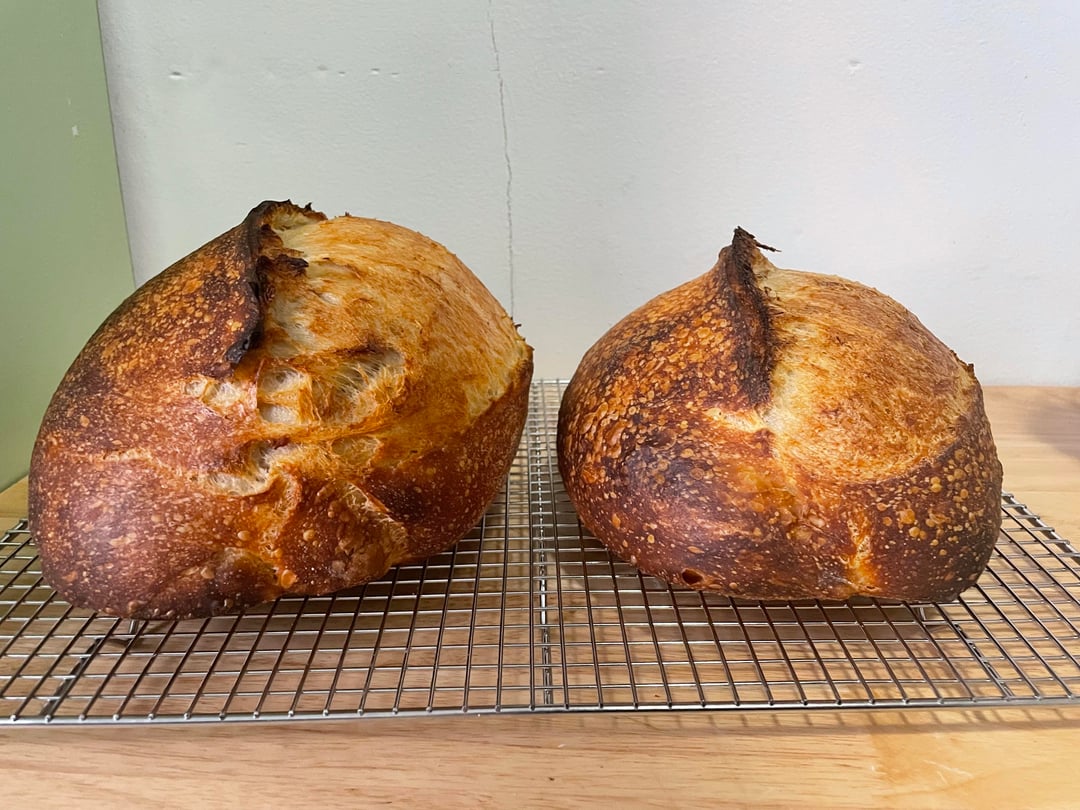 On the slightly larger loaf on the left, I actually took the time to spray the bread every 5-10min and put the lid back on, which let the oven spring really go crazy it seems! However the next bake after that I didn’t even spray the bread once, just put the lid on, and it still oven sprange beautifully.