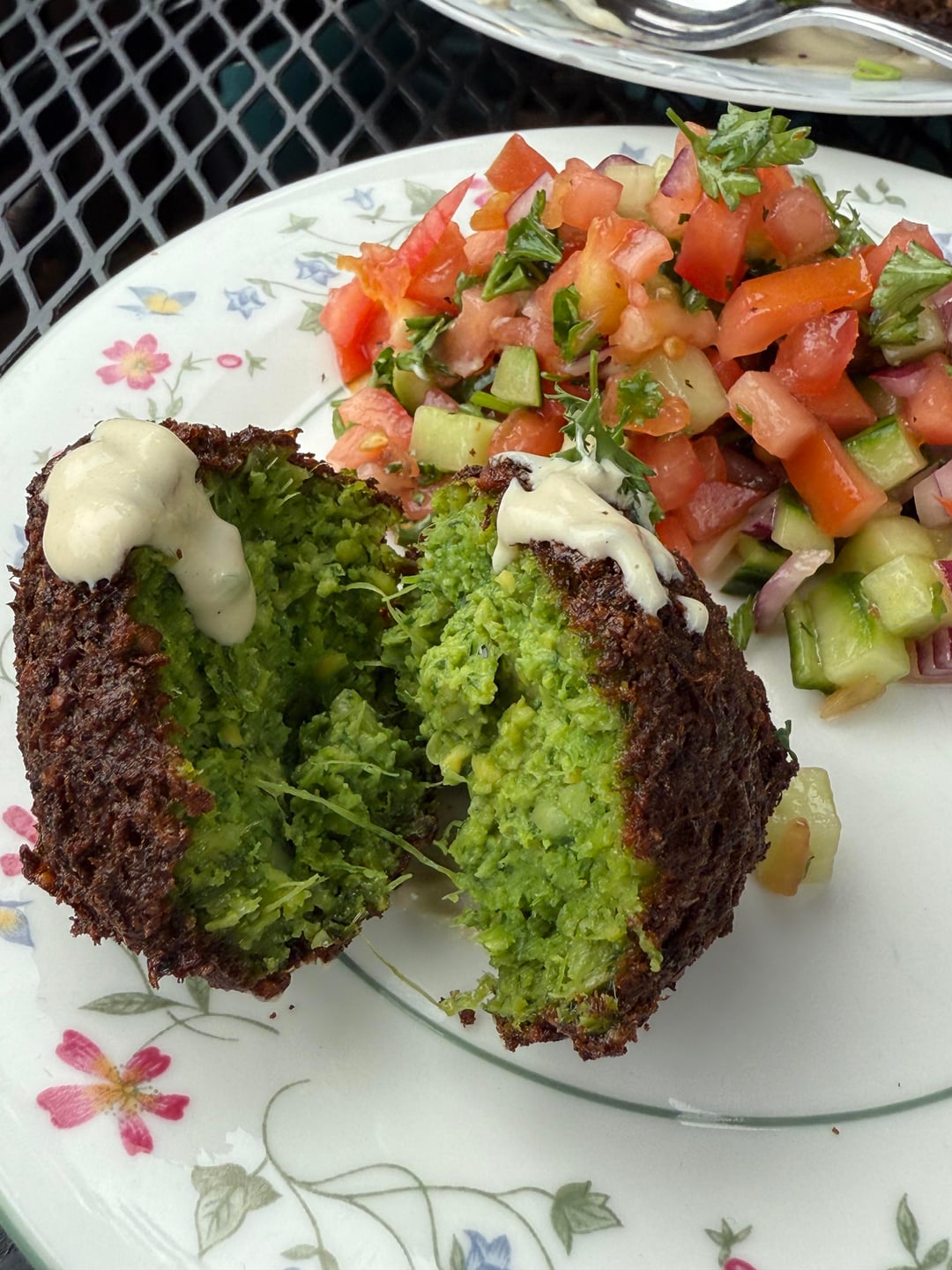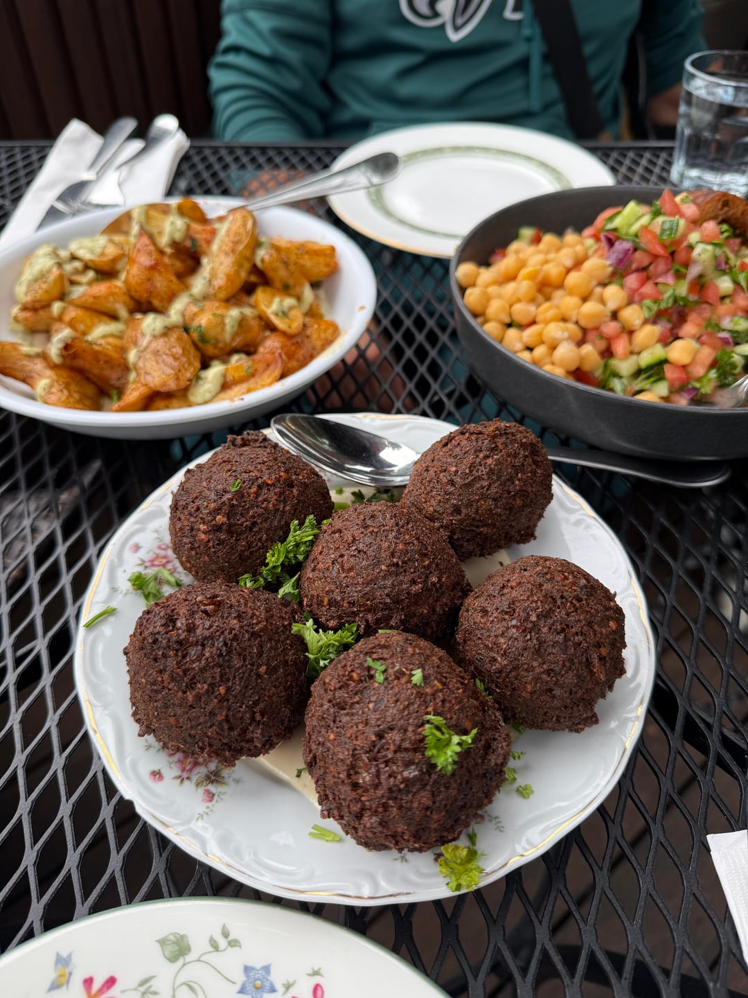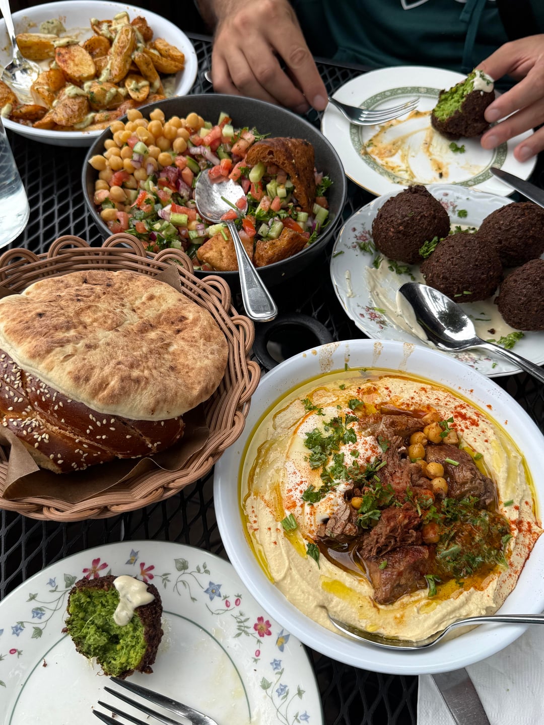 falafel, Israeli salad, wagyu brisket hummus with challah and pita, + fingerling potatoes … we’re stuffed !!! the portions are huge – definitely good value and a place I’d go back to. only criticism, the waitress was really pushy with trying to get us to order more food, coffee, mixed drinks (I’m very visibly pregnant), and dessert when we didn’t even finish the meal and took 1/2 of this home lol.