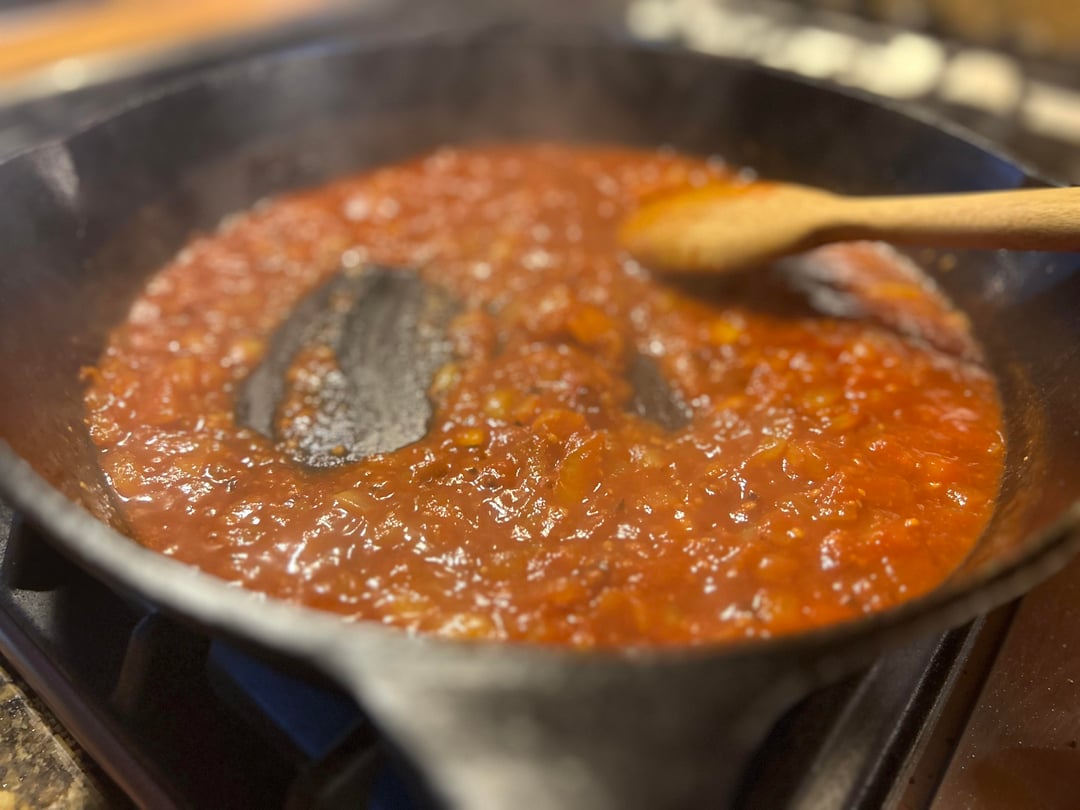 It’s best not to cook tomato sauces in cast iron as it strips previously cooked food from the coating.