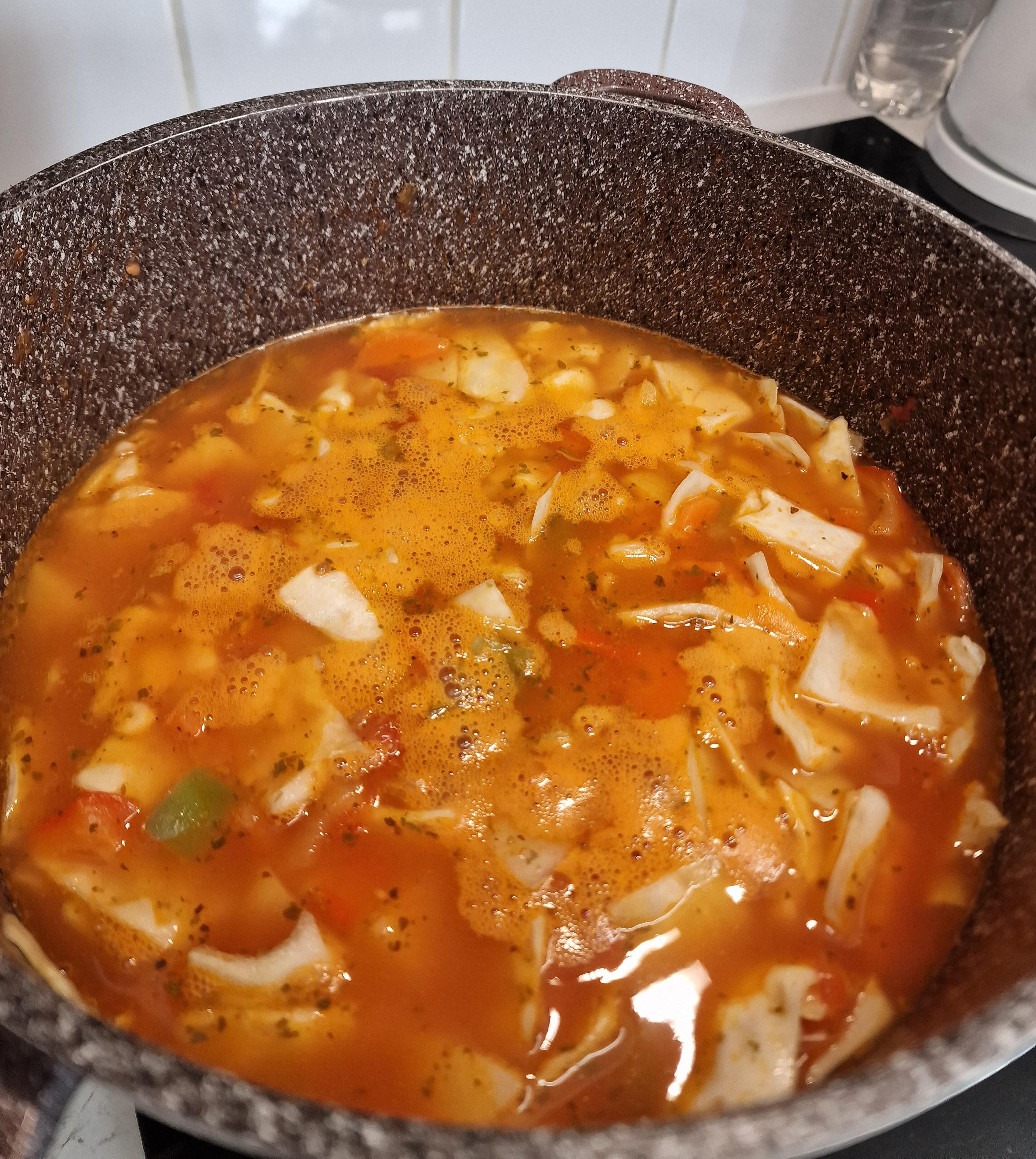 Sautee onions, bell peppers, and carrots. Add a veggie broth(2 cubes) and add sliced white cabbage. Let it boil intil the cabbage softens, for spices I just add salt, pepper and dried parsley, the veggie cubes already give it a really nice taste.