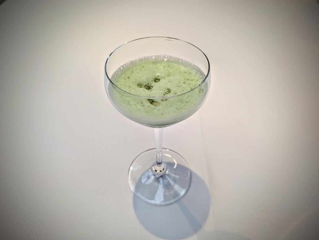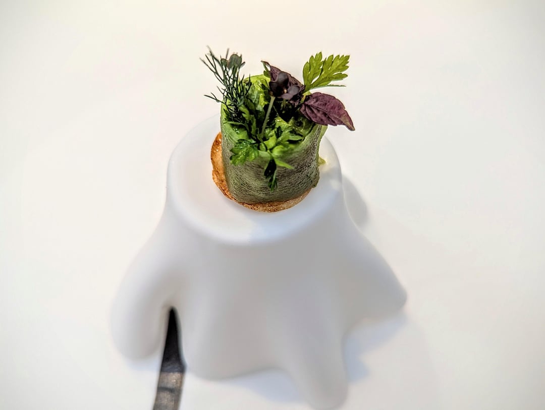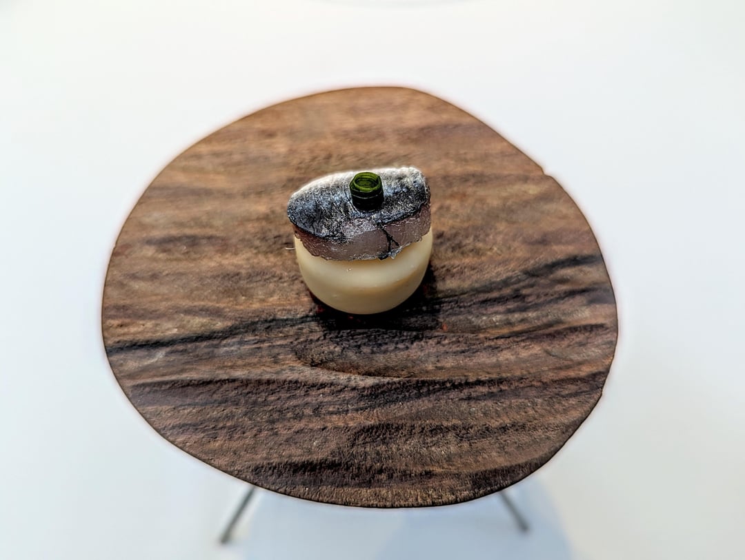 The first appetizer to quickly appear was the vegetable sriracha cocktail, that is mixed in front of guests, accompanied by the crispy coca (a Catalonian pastry) with Iberian pancetta and payoyo cheese. A lively start, the spice from the cocktail awakens the taste buds, and equally works well with the delicious bite of pancetta. The anchovy bonbon that followed was bursting with that self-same flavour (quite literally), while the tuna, daikon and herb cream appetizer was as herbaceous as the anchovy was briny. The ham rounded off the appetizers – an excellent start to the meal.
