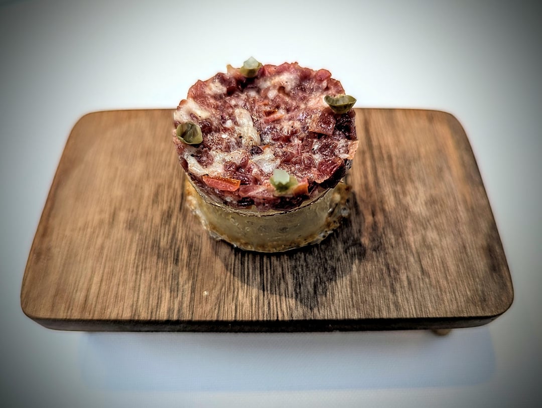 - 'Trinxat' of house-aged Iberian pork chop, cabbage jus and crispy root