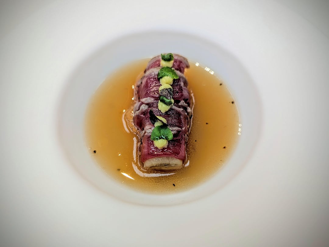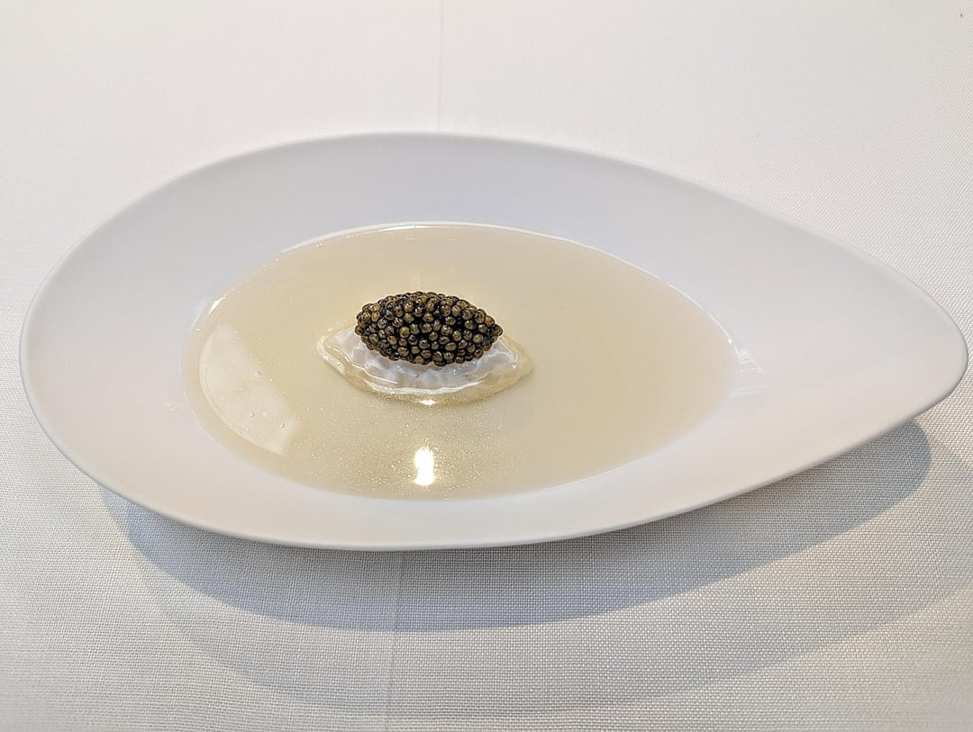 - Cured squid, poultry consome and caviar