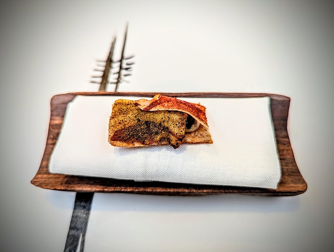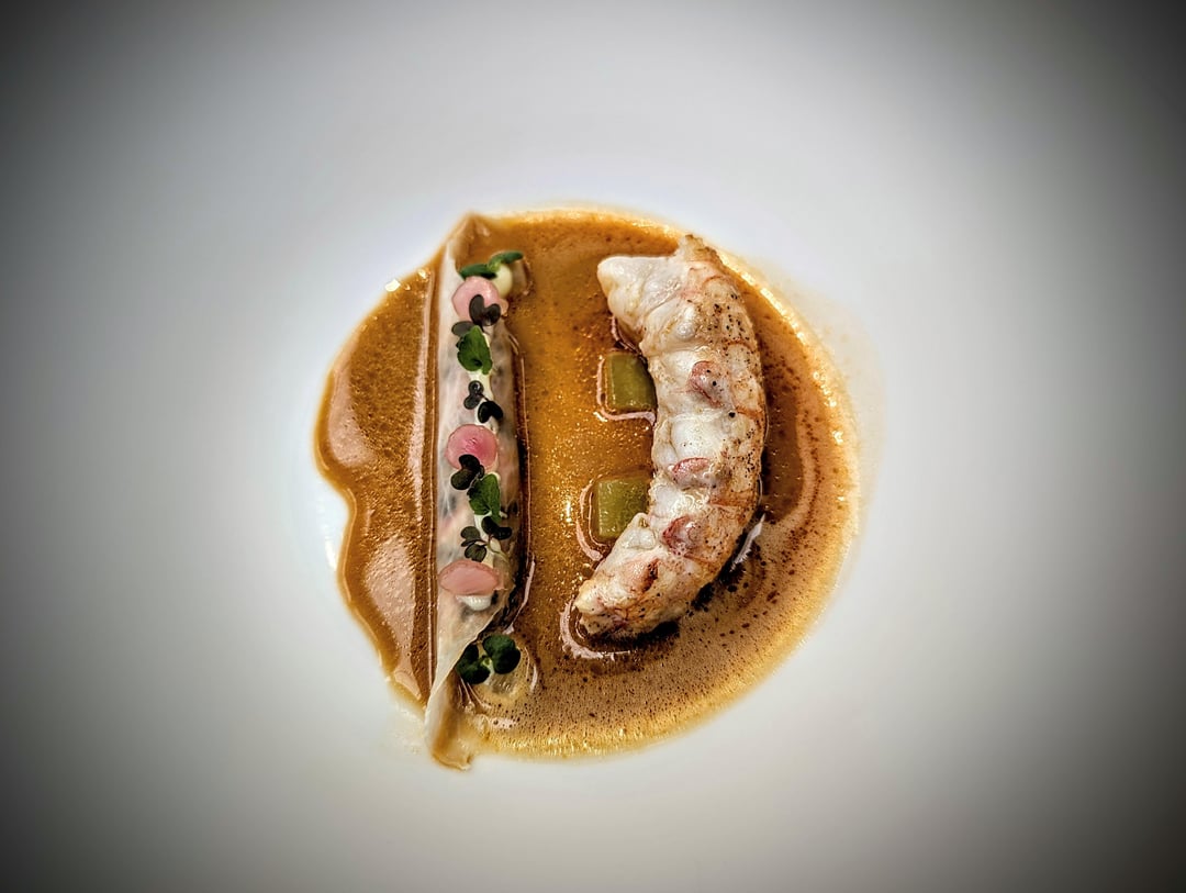 - Langoustine, bone marrow sauce, fermented lemon and charred seaweed