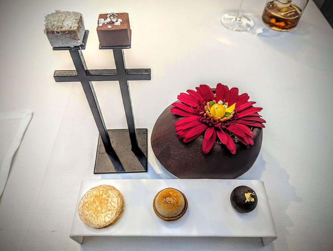 The desserts were no less pretty, though I don't think it was necessary to have both the palate cleanser of seasonal citrus and the peach dish that followed. Neither of these really hit home, though the chocolate dessert (while probably being the ugly duckling of the menu) was perhaps the best chocolate dessert I've had. Decadent in just the way a chocolate dessert should be.