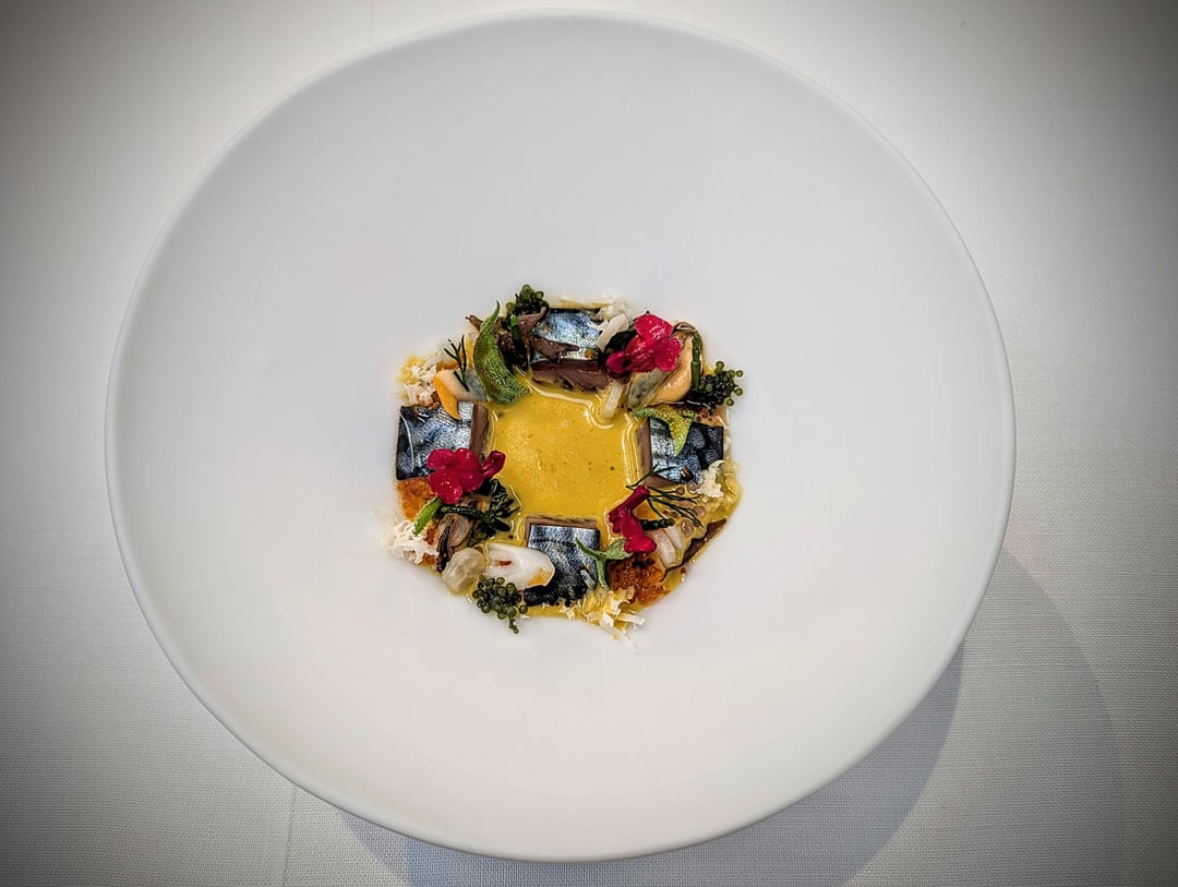 - Marinated mackerel, cockles, razor clams, seaweed, dendê gazpachuelo, and kalix caviar