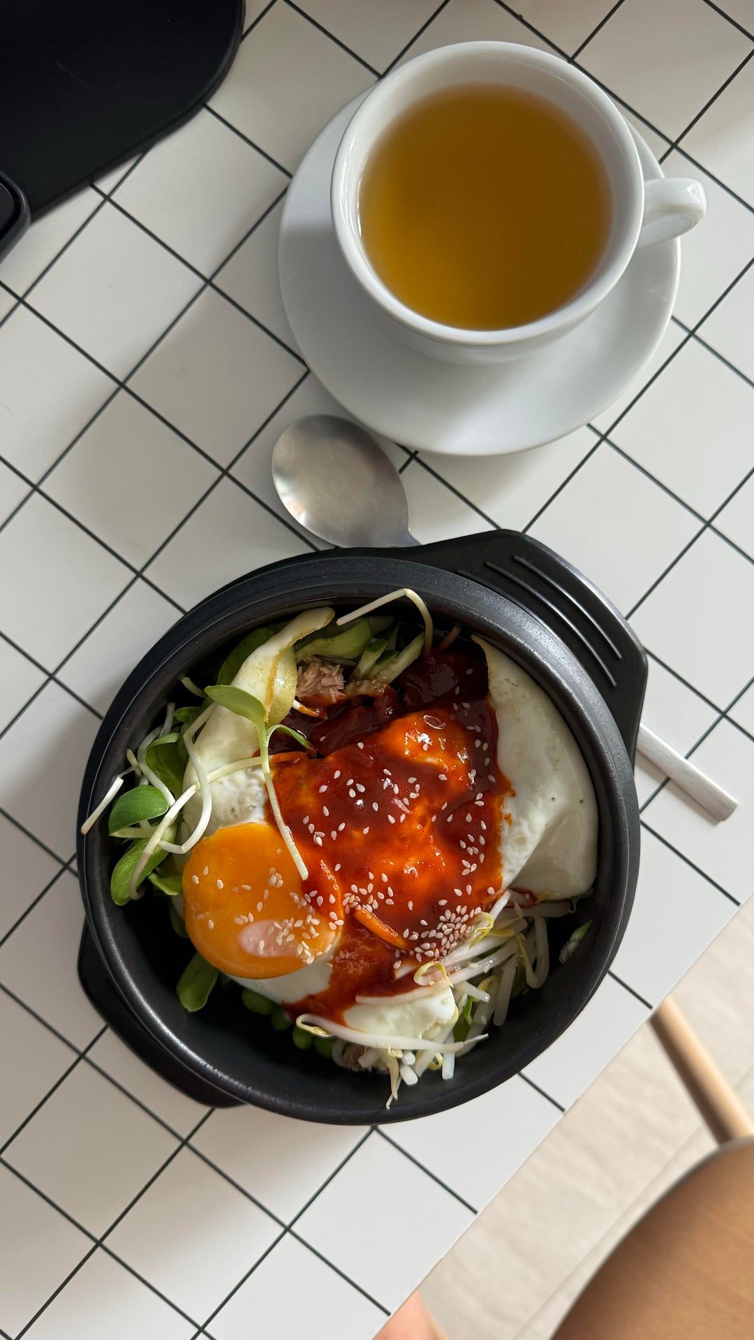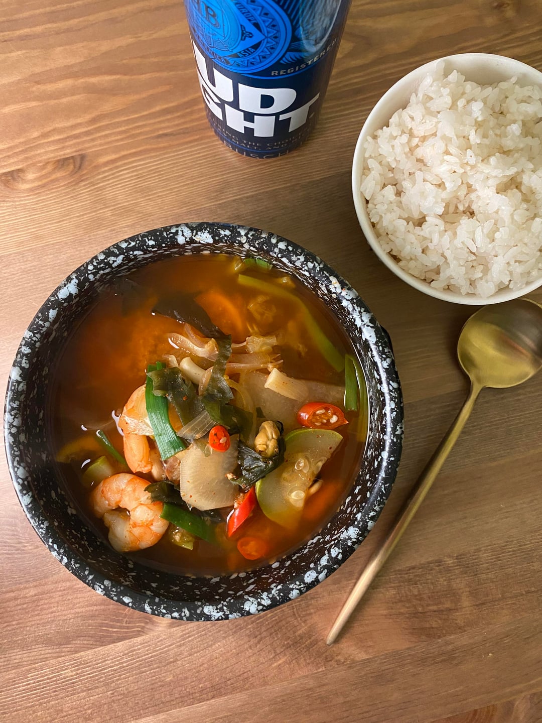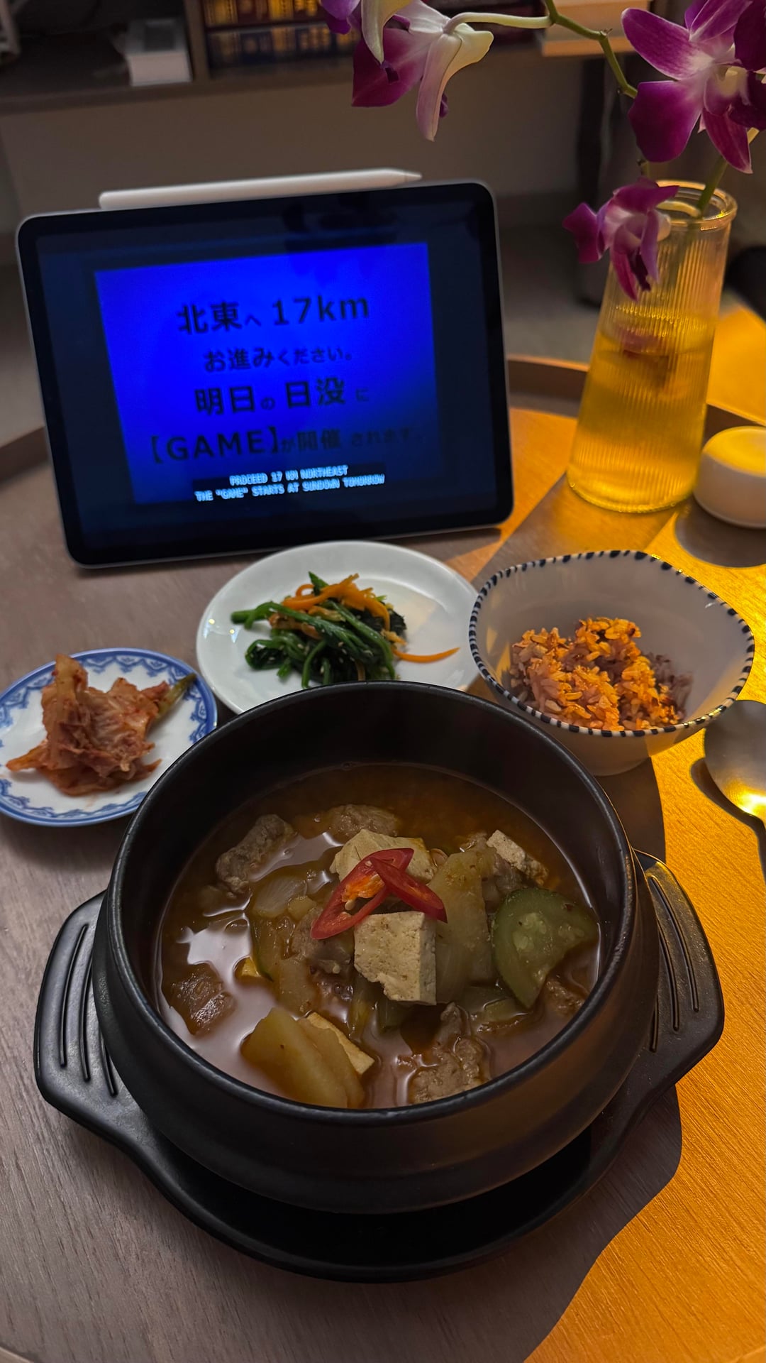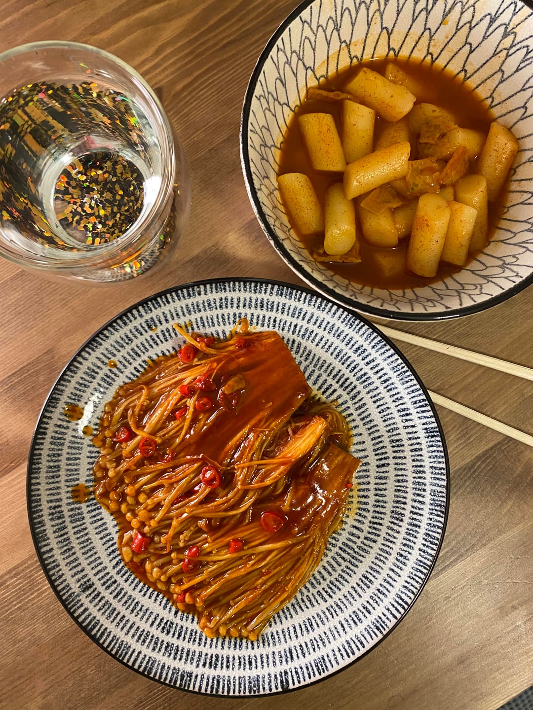 1 – Doenjang jjigae + spinach banchan, 2 – Kimchi jjigae, 3 – Bibimbap, 4 – Miyeokguk, 5 – Yukgaejang, 6 – Jjimdak, 7 – Byeongeo jorim, 8 – Sundubu jjigae + kkakdugi, 9 – Jjajangmyun, 10 – Bibimbap again, 11 – Haemultang, 12 – Bibimmyun, 13 – Spicy enoki mushrooms, 14 – Maeuntang, 15 – Rapokki, 16 – Corn cheese