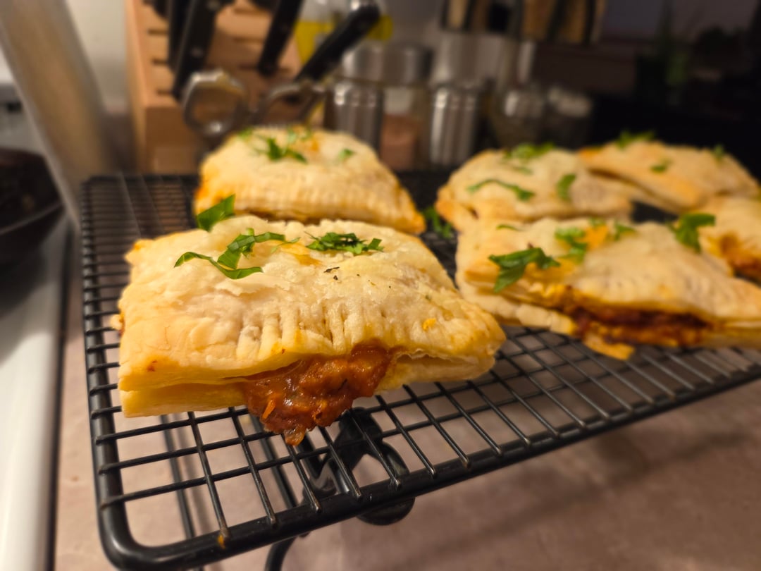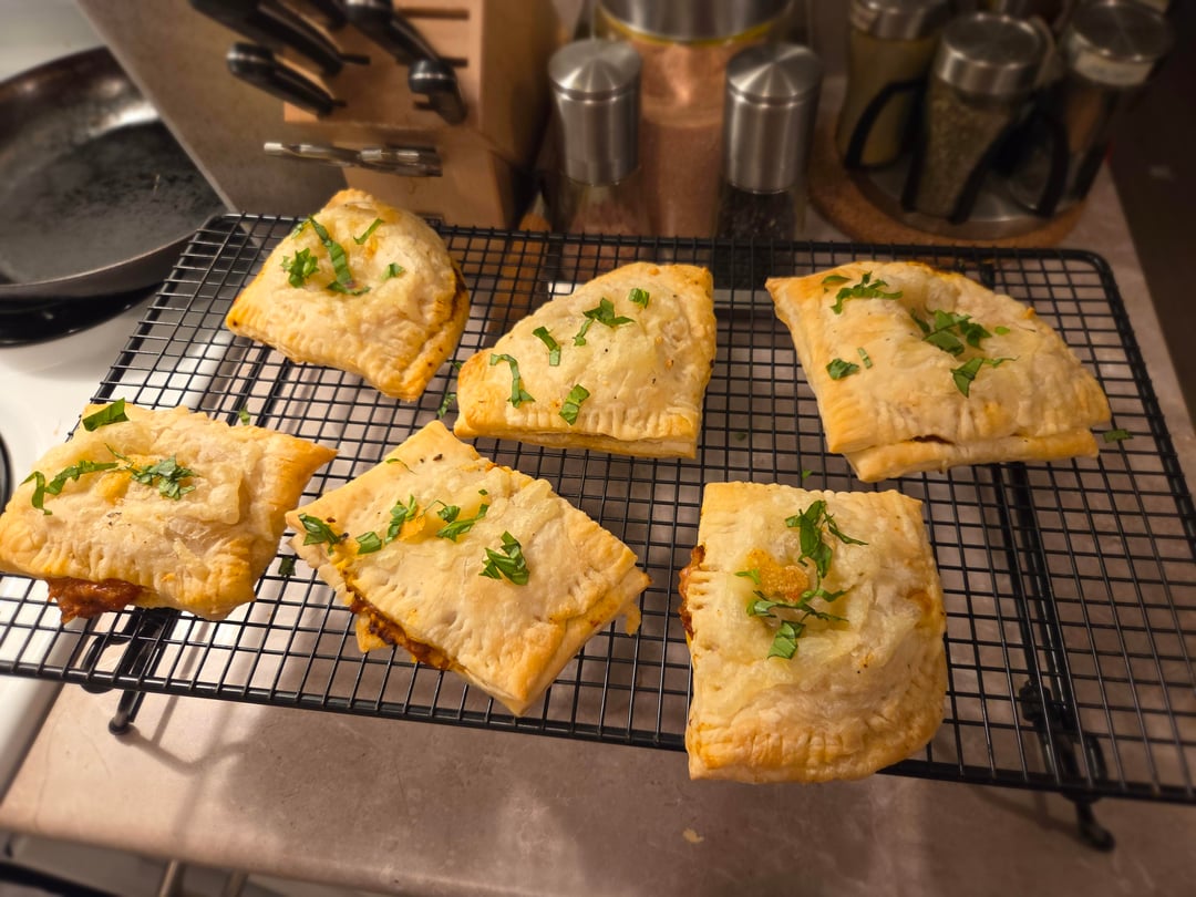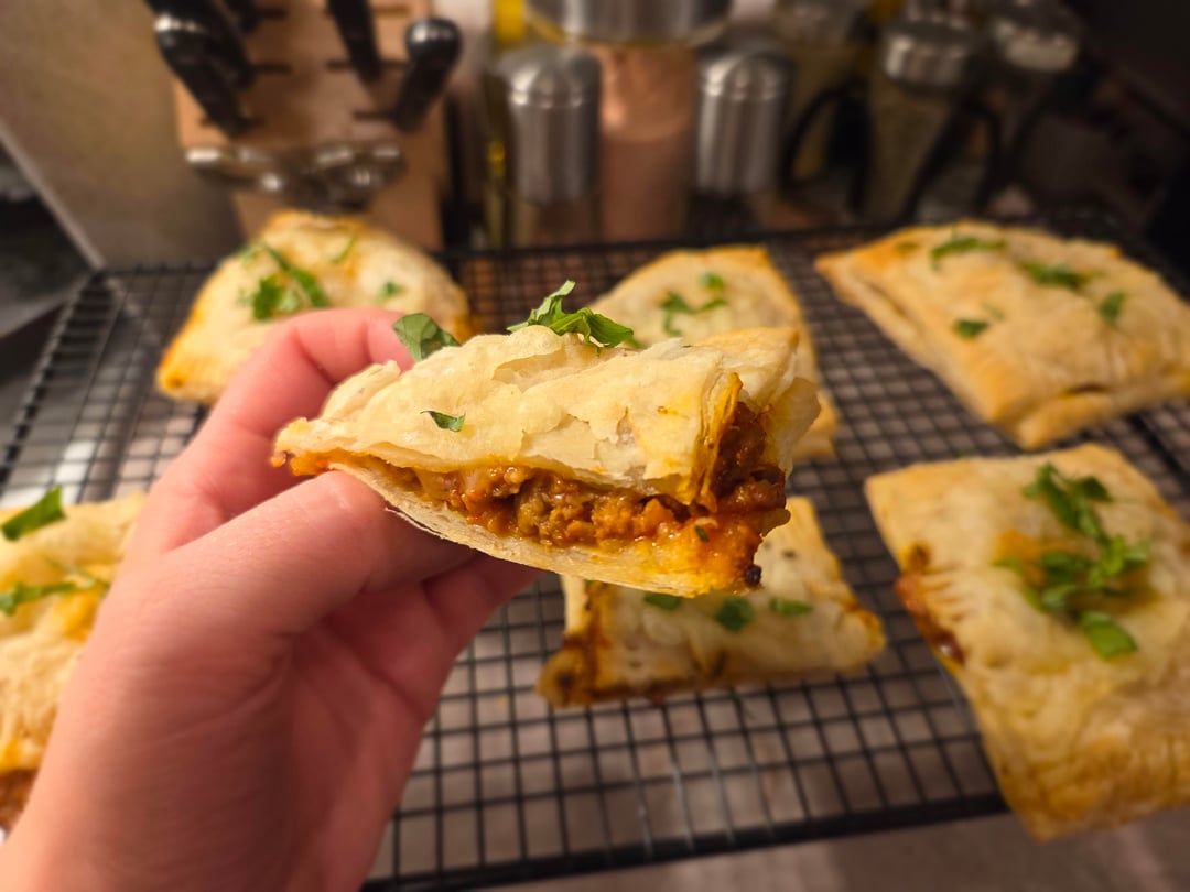 Cooked up some beyond burgers and crumbled them with sautéed bell peppers, red onion, garlic, crushed tomatoes and some spices (oregano, basil and chillies flakes) to make the filling. Rolled out some puff pastry, cut into pieces stuffed with the filling, violife mozzarella and sealed with a fork. Baked at 400 for 10 min, took them out basted in garlic butter and added more mozzarella on top, baked another 10 minutes and garnished with fresh basil. So good.