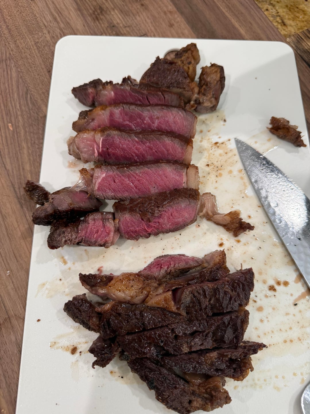 That looks awesome! Beautiful dark brown crust with minimal gray band. And a nice medium rare. Congrats!