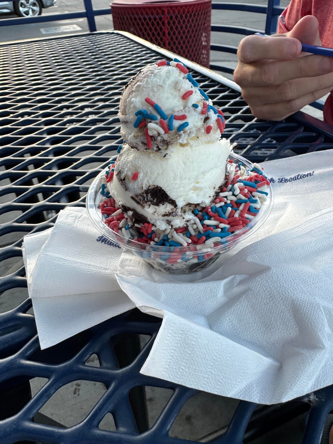 I was in La Quinta, CA, celebrating my birthday and we stopped at Handel’s. I have been wanting to try it! Also, two locals recommended it to us so we were excited. It was yummy! Fun experience with ordering at the window too. We got to see all of the barrels of ice cream inside.