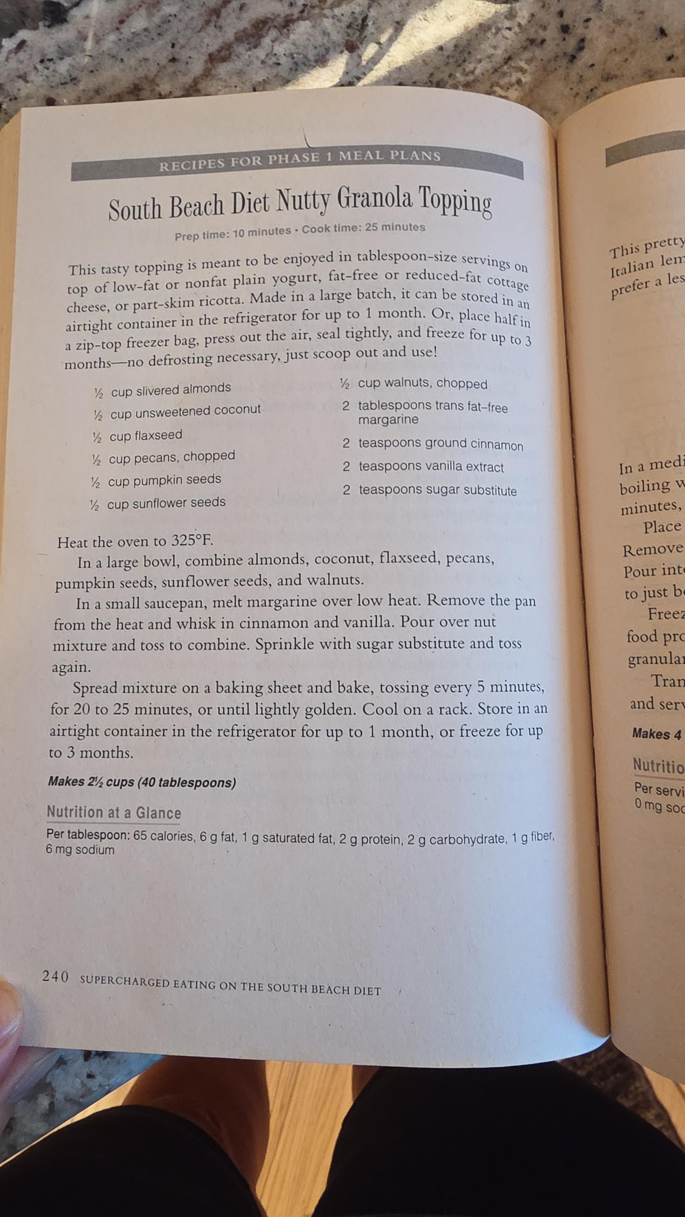 Here’s the recipe in text: 1/2 cup slivered alminds 1/2 cup unsweetened coconut 1/2 cup flaxseed 1/2 cup chopped pecans 1/2 cup pumpkin seeds 1/2 cup sunflower seeds 1/2 cup walnuts 2 tbsp butter 2 tsp cinnamon 2 tsp vanilla extract 2 tsp sugar substitute