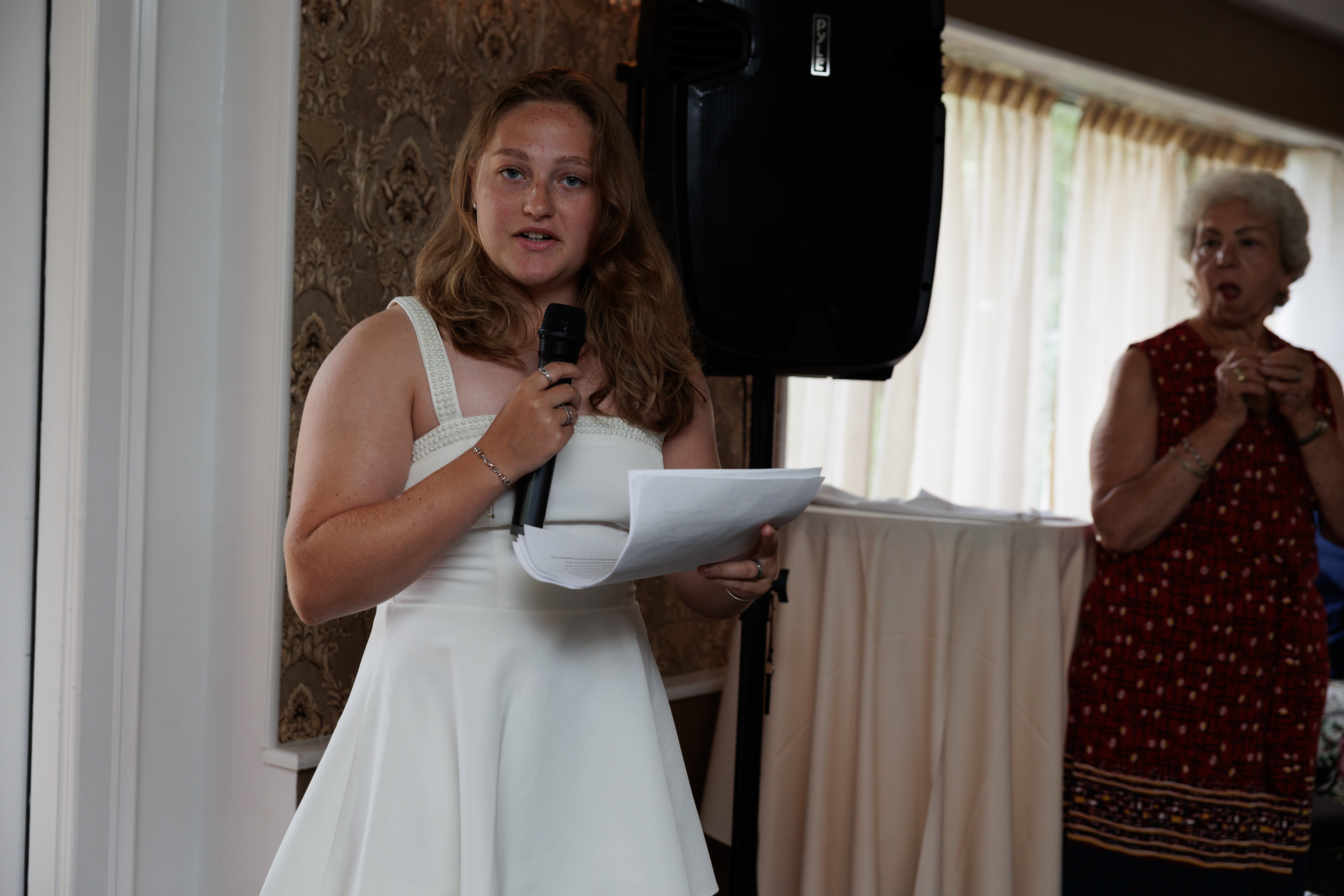 Scholarship recipient Rose Cohen recites her essay during the Italian American Women’s Center’s annual scholarship lunch. Photo by Paul Frangipane