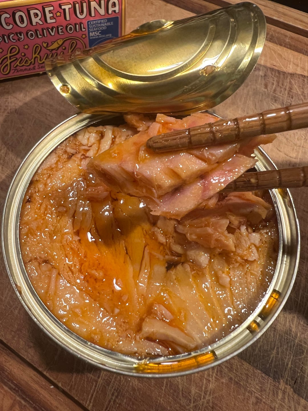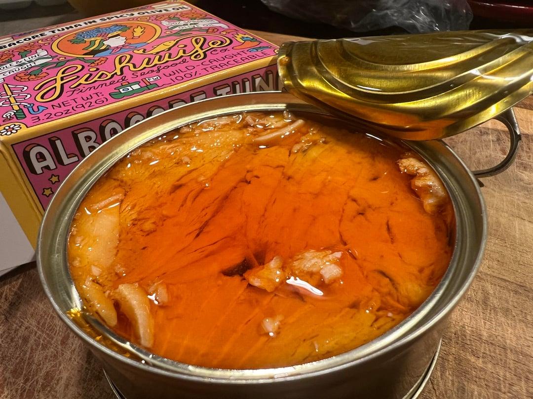 I made it into tuna salad with Kewpie mayo and sweet relish, and holy crap, this is several levels above the best tuna salad I’ve ever had! It’s not even the same thing. All the other flavors come out in the mayo that I couldn’t taste before, and the mayo gets nicely pinkish/orange from the oil