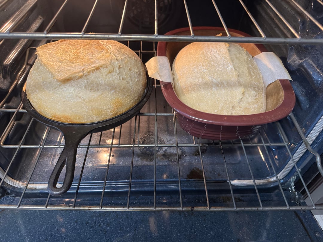10) Remove the bread from the oven. Preheat the oven to 500°F with your baking vessels inside the oven. Once preheated, carefully remove baking vessels from the oven, place bread inside and bake covered for 20 minutes. After this initial bake, remove the lids and contour baking for 10 to 20 minutes until the desired color is achieved.