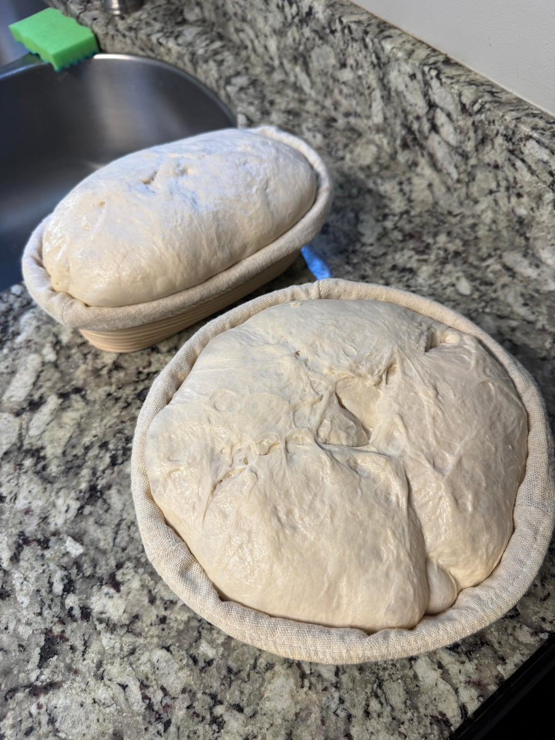9) Fold into final shape, place inside floured bannetons (I use 50/50 rice/WW), and allow them to rise in the oven with a light on for 3 to 4 hours. Alternatively you can also cold proof these in the refrigerator for about 8 hours before baking.