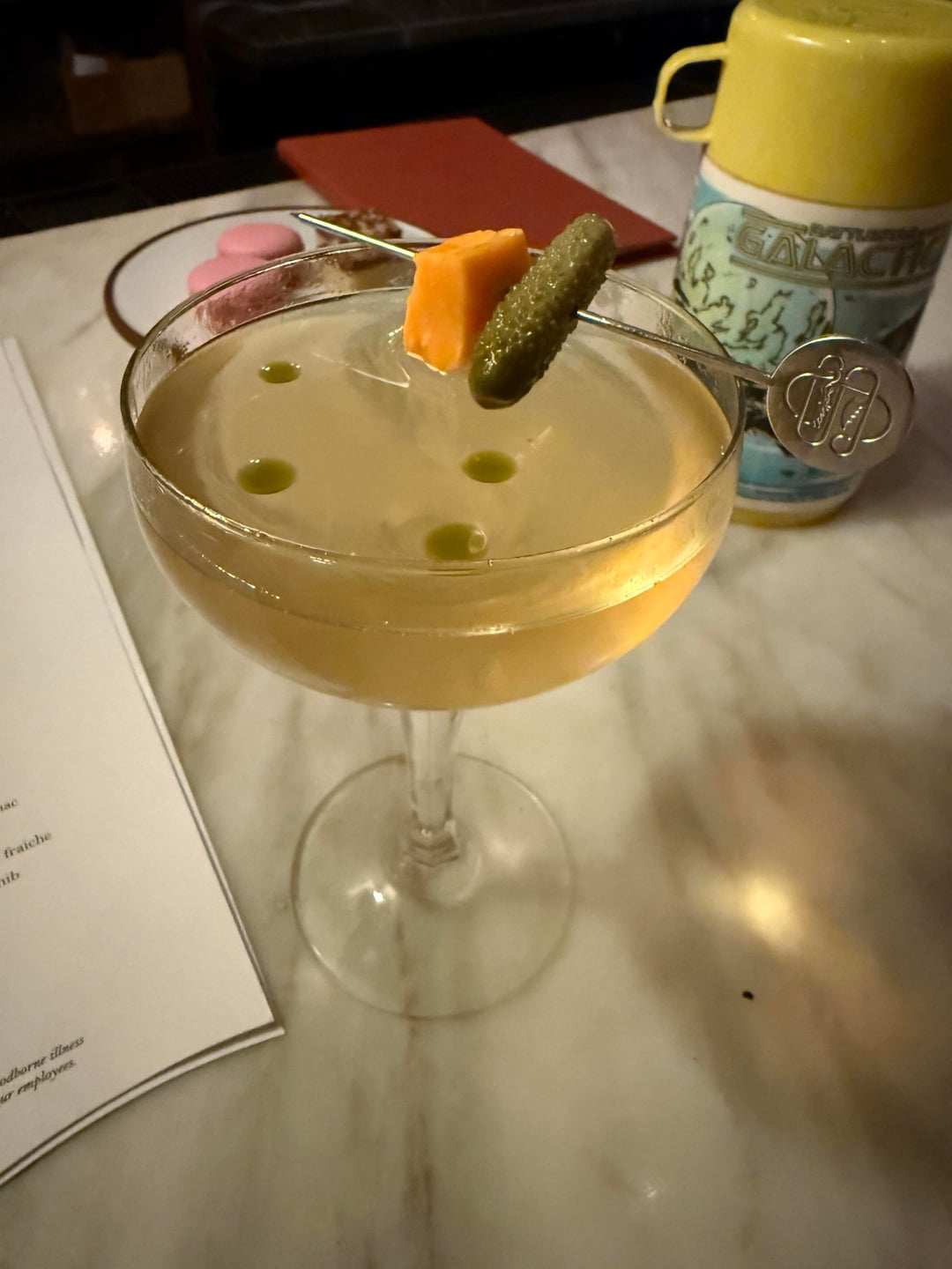 Pic 14: their famous cheeseburger martini (pickle rum fat washed in beef tallow, dill oil, cheese and pickle on skewer)