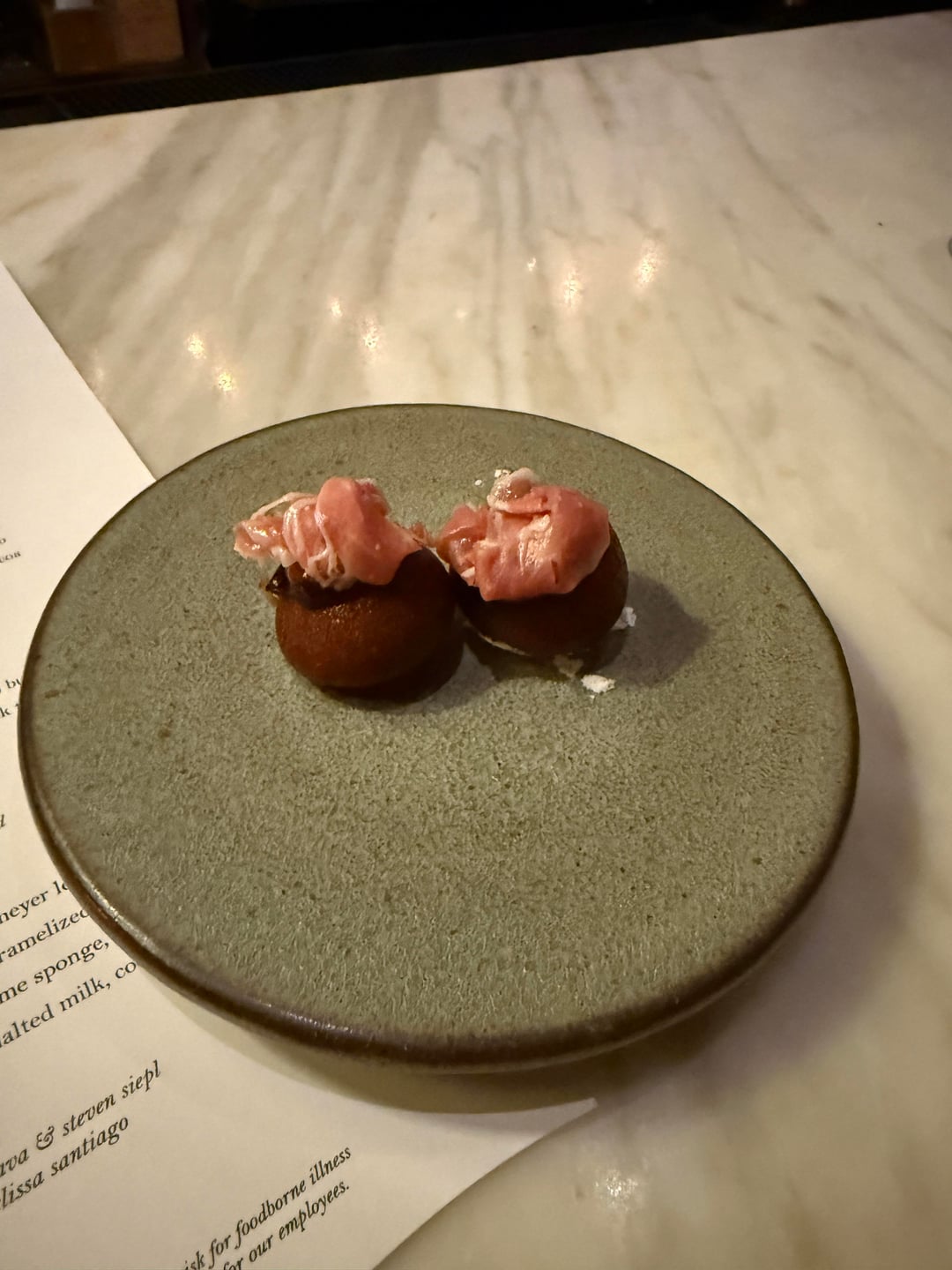 Pic 2: surprise amuse bouche – corn fritter with balsamic jam and country ham