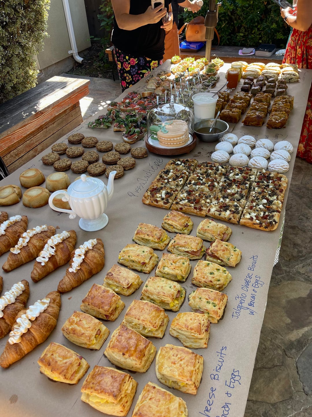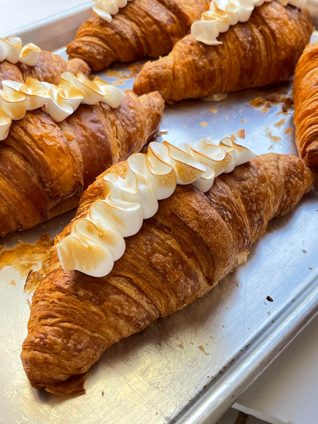 Finally the stars aligned and I set up a time for my baker friends and I to bake and enjoy the fruits of our labor. I was happy to host and made 4 things— Currant Scones, Double Ginger Scones, Jalapeño Cheese Biscuits with Bacon and Eggs, Key Lime Croissants with Torched Italian Meringue, and Pumpkin Macaron Cake with Pumpkin Caramel and Vanilla Swiss Meringue Buttercream. My friends brought Savory Tartines, Oatmeal Cookie Sandwiches, Apple Charlottes with Crème Anglaise, Pumpkin Croissant Bread Pudding with Caramel and Whipped Cream, Pissaladiere with Olives and Mushrooms, Walnut Cookies, Dubai Chocolate Cheesecake Cups, and Banana Bread.