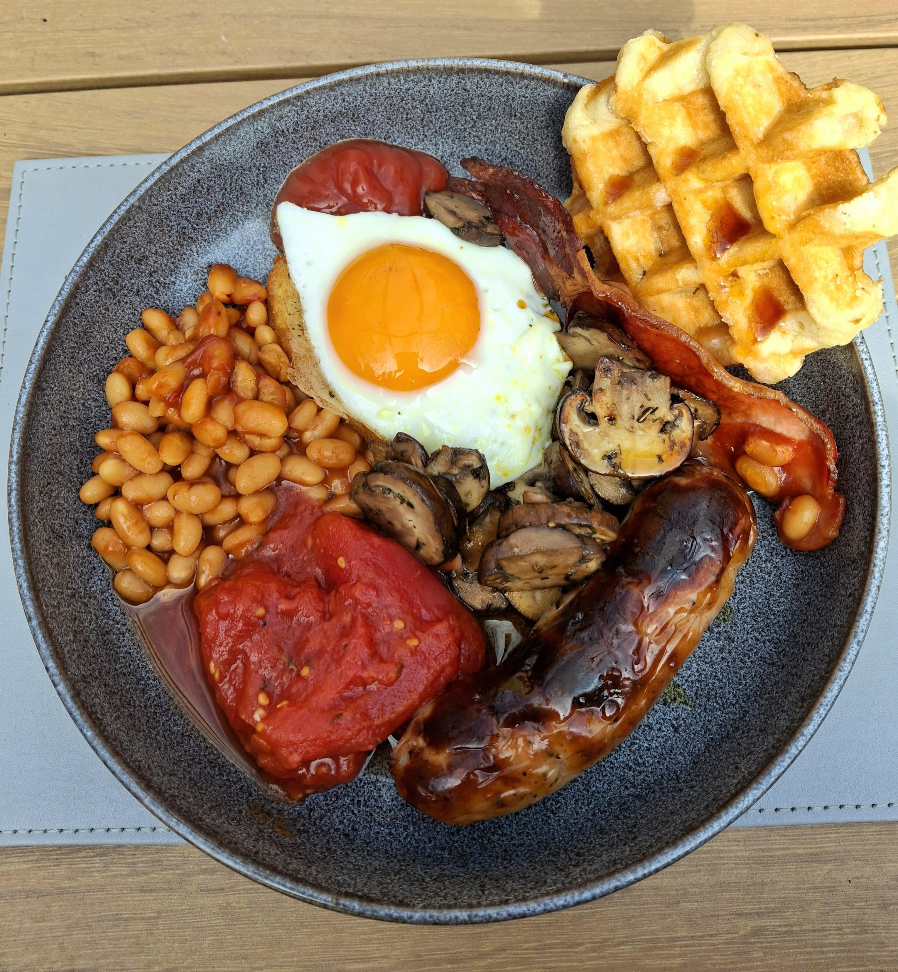 Sausage, bacon, fried egg, mushrooms, tomatoes, hash brown, baked beans, waffle. I hope this appeases the fryup Gods. I do not like bacon, so this is my first time eating it as an adult. I remain unconvinced.
