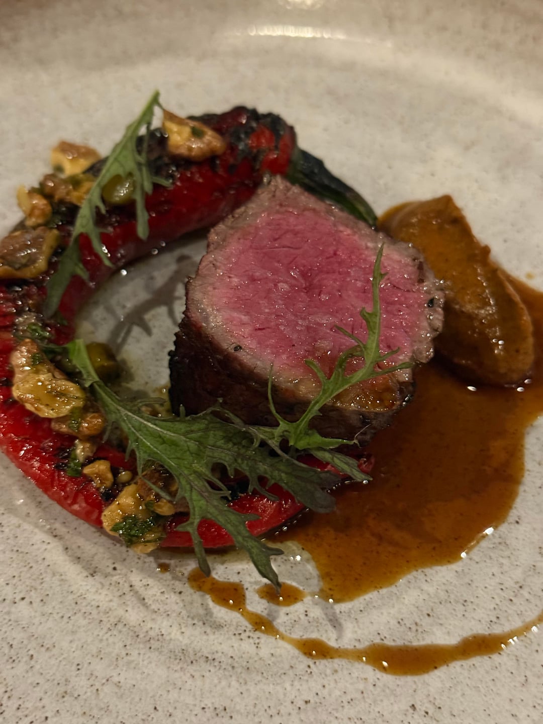 Wood-Roasted NY Strip. Smoked Pepper. Jimmy Nardello Peppers. Walnuts.